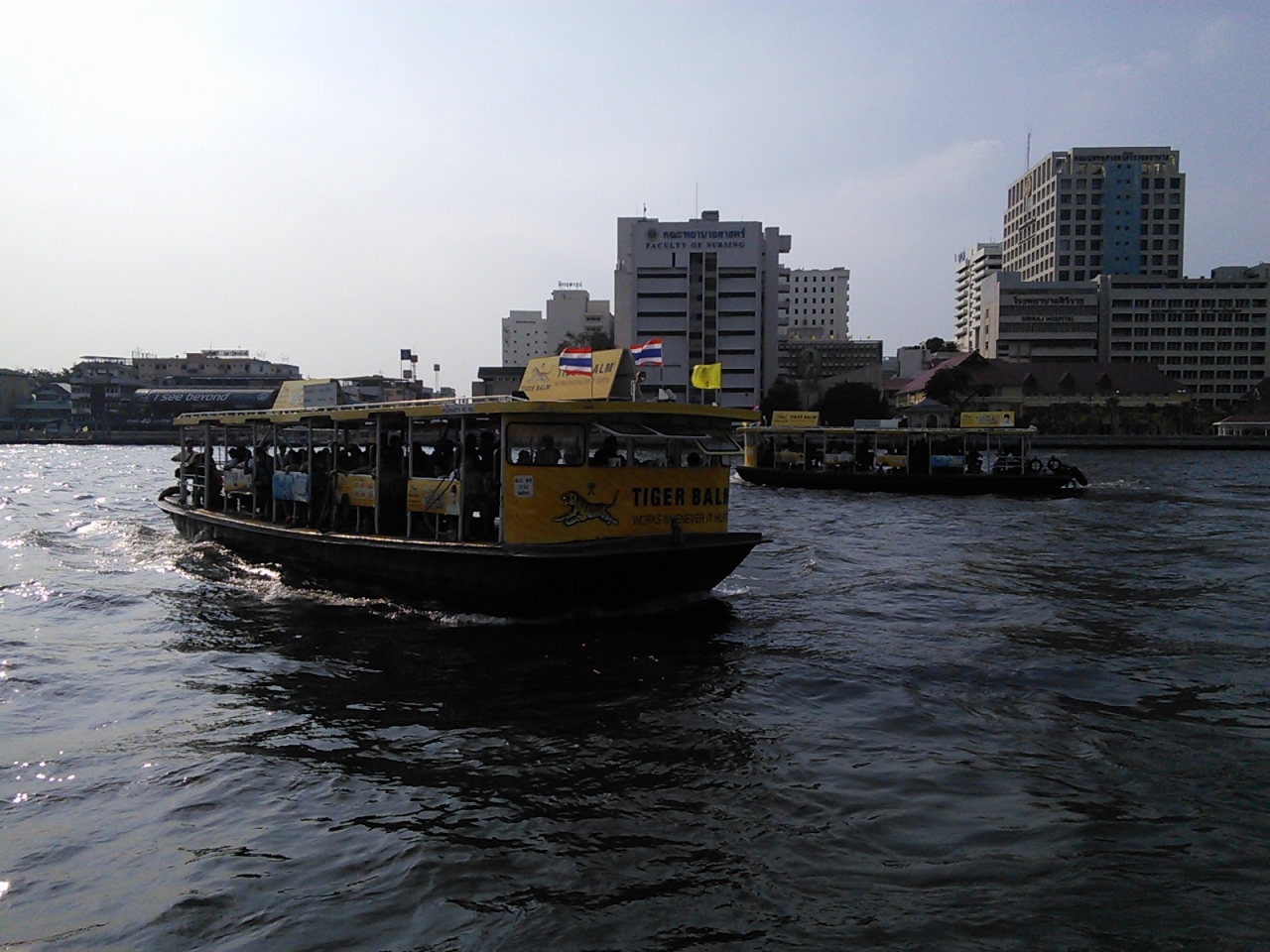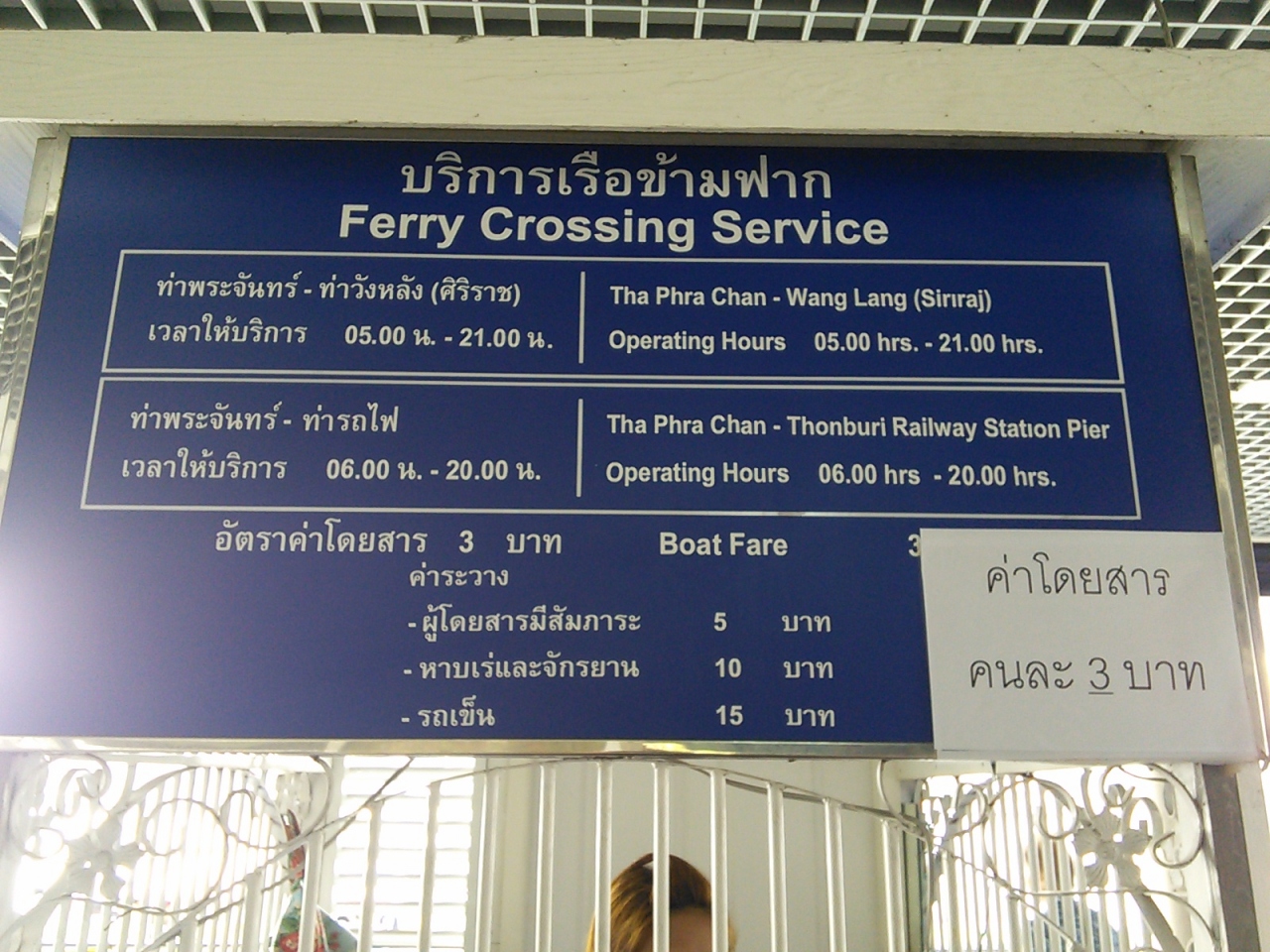 王宮前広場の西側、タマサート大学の南出入口に「Phra Chan」船着場はあります。しかしこの船着場は川の対岸へ渡る渡し船専用です(チャオプラヤエクスプレスは止まりません)。行き先は2ヶ所、トンブリー駅とワンラン。いずれも片道3B。乗り場は別れており船の屋根の上にも行き先が書かれていますので間違えることはないと思います。トンブリー駅へはバスでは行きにくいので利用価値はあります。