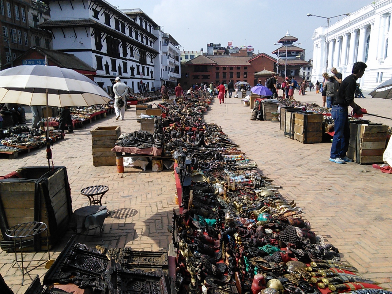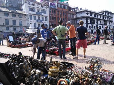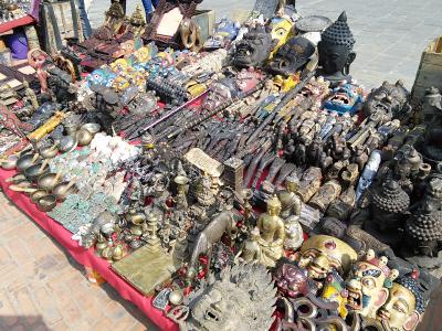 土産物屋がびっしりです。そのわりには観光客の姿はまばらでそれほど多くはありません。どの店も似たようなものばかり、一見骨董風にも見えますが実際どうなんだか。カトマンズではタメルと並んで最もお土産価格の高い場所だと思います。こんなものは値段があってないようなもの、とんでもない値段を言ってくるでしょう。値段交渉するだけで疲れてしまいます。まあ自分の納得できる値段で買えばいいのですが…。買う気がなければただ眺めるだけにした方がいいです。
