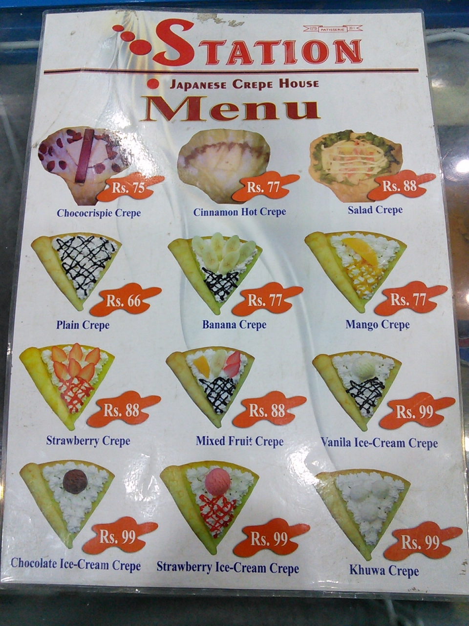 日本にはないKhuwa Crepe(Khuwaとは牛乳から作ったらスイーツらしいです)とかもありましたが無難にVanila Ice-Cream Crepe(99Rs)を食べてみました。うまーい。日本のものとそれほど違いはなくおいしかったです。