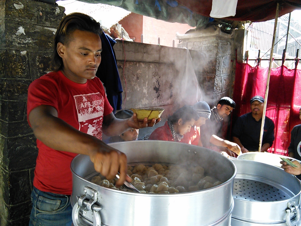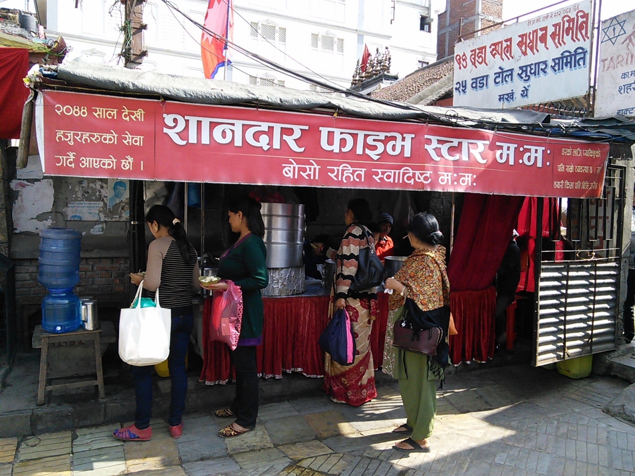 ダルバール広場からインドラチョークへ向かう道の右側にあります。一度前を通ったとき(15:00頃)行列ができていました。店を覗いたらモモを蒸すのが間に合わず皆待っている状態でした。で後日行ってみました。赤地に白文字で 「Sandar 5Star Momo 」と店名が書いてありますがネパール語表記のみ。12:30開店。開店直後は客はまばらですぐに買えました。メニーはバフモモのみ、10個60Rs。白っぽいソースとチリソースをかけて食べます。少し小ぶりですがバフ肉がぎっちり詰まっていて油っぽくなくておいしかったです。しかし並んでまで食べるくらいかは…、まあネパール人にしか分からない微妙なウマさというのがあるのでしょう。昼飯には若干足りないかなという感じです。店の隅で男衆5人が黙々とモモを作る様はなかなかシュールです。一度見に行ってみて下さい。