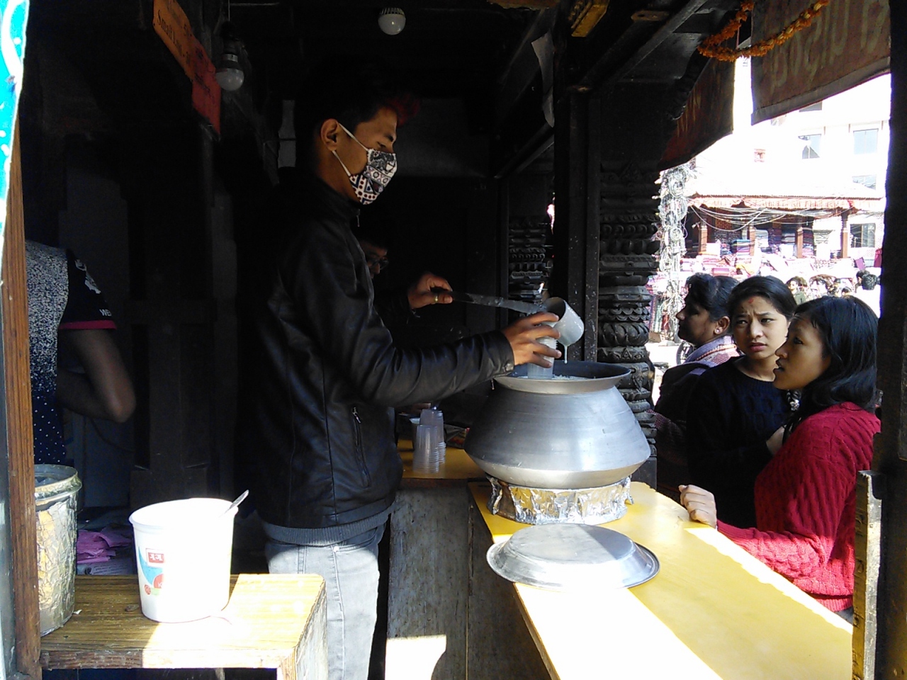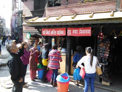 インドラチョーク、アカシュバイラヴ寺院の向かって左側の軒下に何やら人だかりが…。なんとこんな所にラッシー屋がありました。それにしてもかなりの人気店のようで次から次へと客がやって来ます。店名を聞いたら少し間をおいて「ラッシーショップ」と。どうも正式な名前はないようです。だったらこの軒先に掲げてある看板は…?、“おいしいラッシーを売っています”「…。」ふつうここに店名書くんじゃ…、まあいいですけど。
