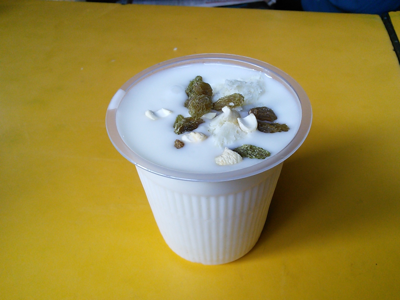 メニューは大(50Rs)or小(30Rs)しかありません。迷わず“大”をオーダー。ラッシーの上に干ブドウ、ナッツ、パンが乗っています。そして一口、うまーい!甘さ加減も絶妙、濃厚でとてもおいしいです。大満足の1杯でした。- 旅行時期