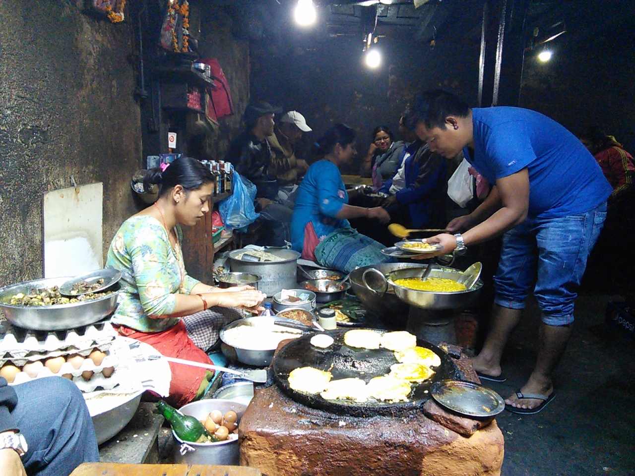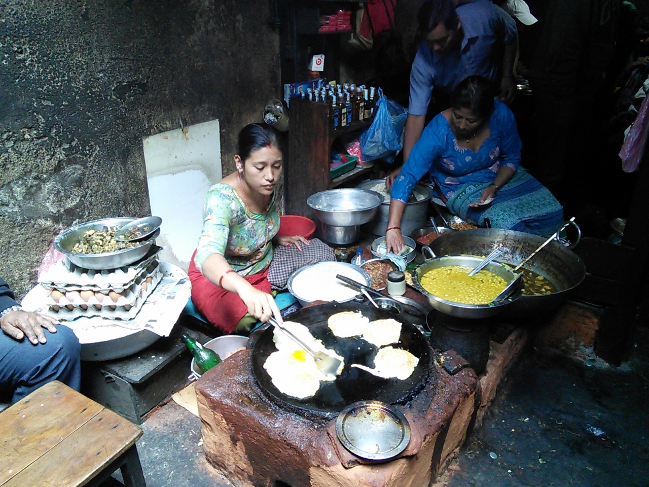 私の持っていた「地球の歩き方03-04」にはカトマンドゥB級グルメのすすめと題してパタンのダルバール広場にある「名もないネワールの飲み屋」が紹介されていました(現在の版に載っているかは未確認)。かなり古い情報だし開発の激しいカトマンズ、こんなローカルな店はもうなくなっているだろうなと思いつつ行ってみたらなんとまだありました。場所はクリシュナ寺院のすぐ裏手。中に入ってまたびっくり、歩き方の写真と全く同じ光景が…、女性がウォーを鉄板で焼いていました。その女性に写真を見せたら母だというからまたまたびっくり。