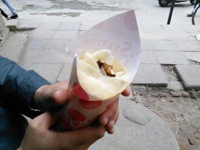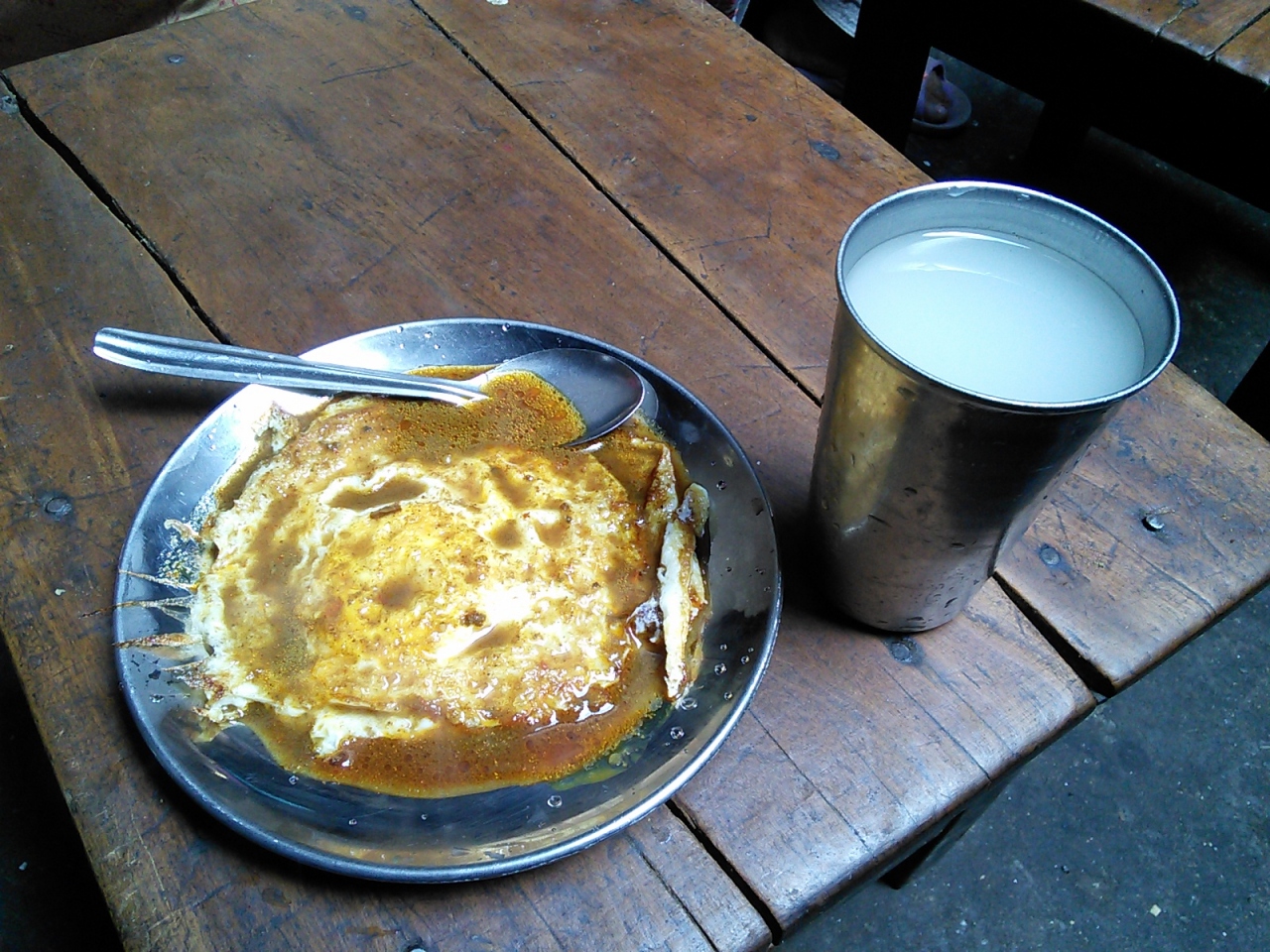 やはりここはウォー(1枚40Rs)をチョイス。ウォーとは豆をすりつぶした生地に肉や卵をのせて鉄板で丸く焼いたお好み焼きのようなもの。味は微妙~でかけた辛いソースの味しかしませんでした。隣の人につられて私もチャン(微発泡性の濁り酒15Rs)を1杯。ローカルな店で飲む酒はたまりません。古い歩き方を思い出しひとりでタイムトリップしていました。- 旅行時期