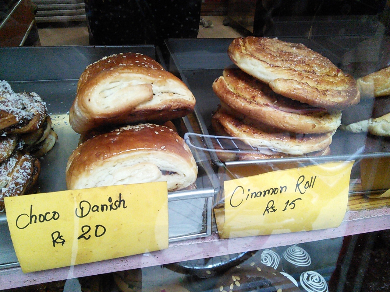 最初にショーケースに並べられたパンを見た時に軽い衝撃を受けました。「シナモンロール15Rs?」値段表示が間違っているかと思いましたがそうではありませんでした。すべてのパンが激安!タメルの物より若干小ぶりですが半値以下。とりあえずシナモンロールとチョコデニッシュ(20Rs)を購入。味もおいしいです。店内で飲み物と一緒にパンを食べることもでします。チャイは15Rsで飲めますがちょっと甘過ぎです。その後ほぼ毎日通いました。毎日食べるならPlain Bun(10Rs)とCream Donut(15Rs)がおすすめ。シンプルなパンですがこのおいしさでこの値段なら断然お得です。