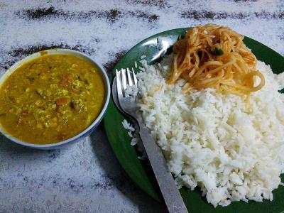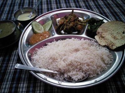 Nepal Thali setのVeg. Rice Set(130Rs)いわゆるダルバートをオーダー。パパドとカードが付いてこの値段ならお得だと思います。味もとてもおいしくおかわりもでき大満足でした。ダルににんにくがガッツリ入っているので元気になりたい人におすすめです。