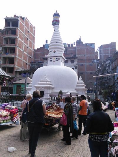 アサンチョークのアンナプルナ寺院脇の狭い路地に入り150mほど進むとストゥーパが見えてきます。上部の尖塔までもが白く塗られ全体が真っ白、コンパクトで可愛らしい印象を受けます。特に観光スポットではなくストゥーパの周りでは布団やぬいぐるみが露店販売されていました。生活感溢れるストゥーパです。