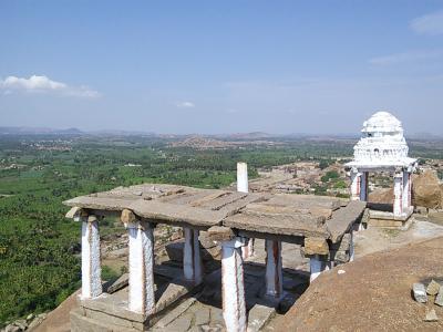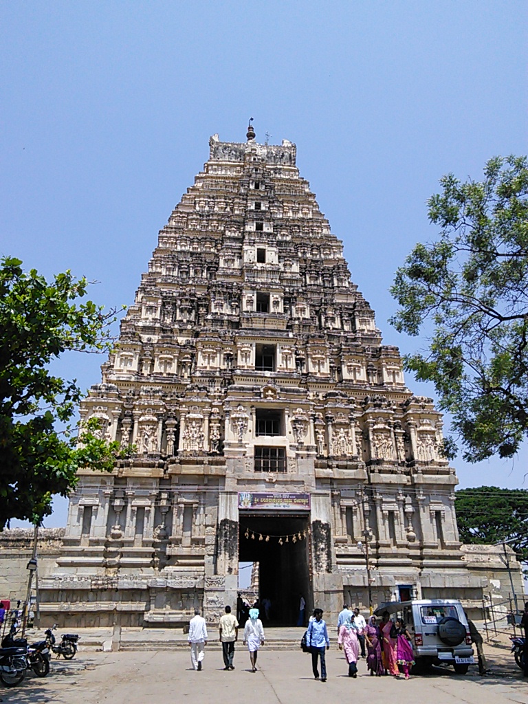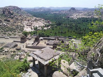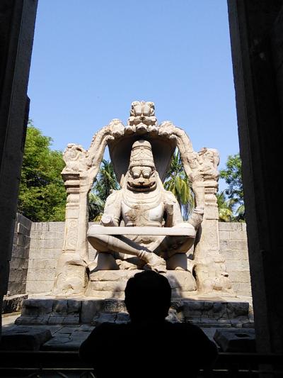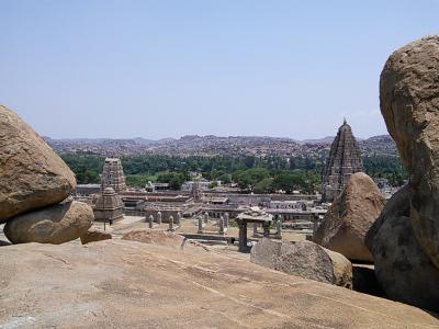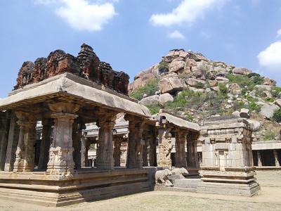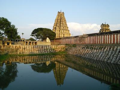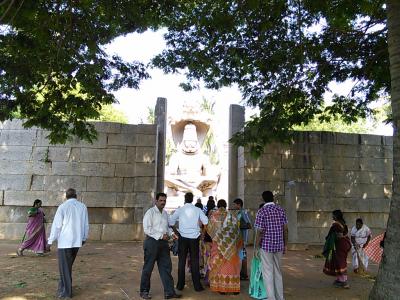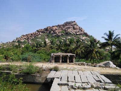 ハンピのシンボル的な寺院で高さ50mの塔門が目を引きます。この寺院は遺跡というよりは現在も活動していて観光がてら多くの人が参拝に来ています。正面から入る人がほとんどだと思いますが北側(船着場側)にある出入口の方に回ると池に映る美しい“逆さ塔門”が眺められます。また、南側の岩山に登ると寺院全体が見渡せます。