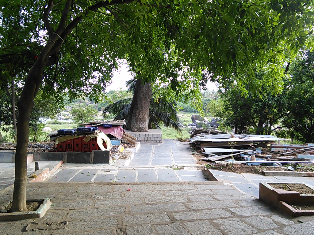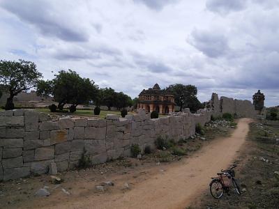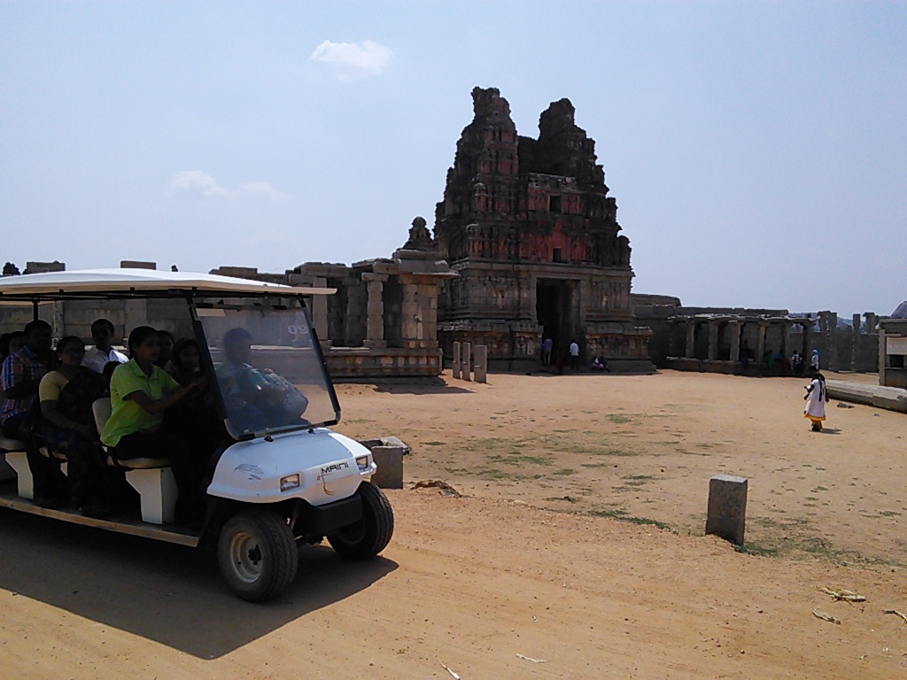 ハンピバザールからなら景色もいいし十分歩ける距離だと思いますが炎天下の下だと結構辛いです。帰りは歩きたくないなという時には寺院の前から約1km東の駐車場まで電気カートが往復しています。(片道10Rs)。そこには他の客にチャーターされたリクシャーが何台か待機しています。交渉次第ではハンピバザールまで行ってくれます。(ちなみに200Rsと言われました。値引き交渉はしてません。)