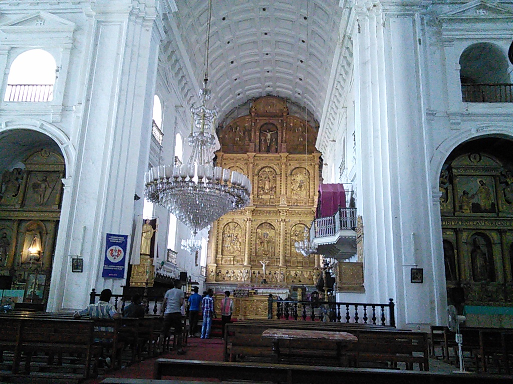 日差しを反射し白壁がまぶしかったです。教会前の芝生の緑も鮮やかでとても美しい場所です。内部はとても広く薄暗くひっそりとし厳かな空気が漂っています。巨大なシャンデリアが低く下がっているのが印象的でした。