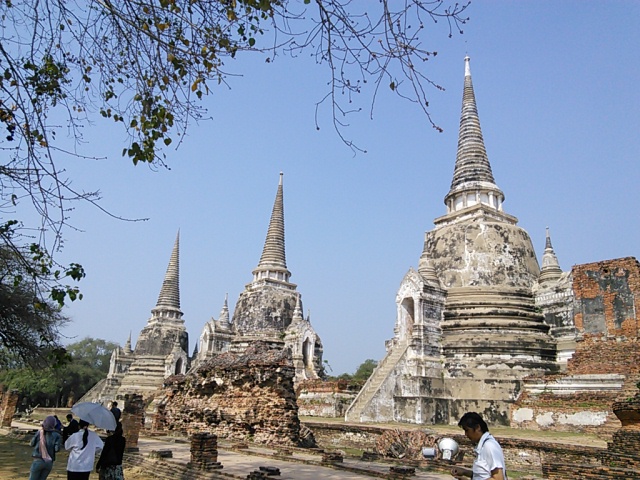 隣のヴィハーンプラモンコンボピットの敷地内にチケット(50B)売り場と入口があります。アユタヤ遺跡の象徴的な三基のチェディが並んでいます。敷地は広いですが他の遺跡はほぼ廃墟状態で頭部のない仏像もありました。今でも修復作業が続けられており、帰りはその通用口からも出ることができました。