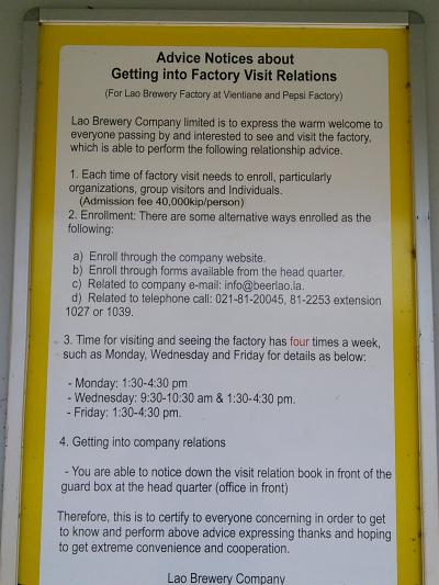 ビルの受付に行くと今は設備の洗浄中なので見学はできないと...。残念!いったいどうなってんの?しかしすぐ横にミュージアムやグッズショップがありました。ミニバーもあったのですが試飲不可。これが一番残念!!ビアラオ大びん8000kip、生ビールジョッキ1杯10000kipで販売してました。- 旅行時期