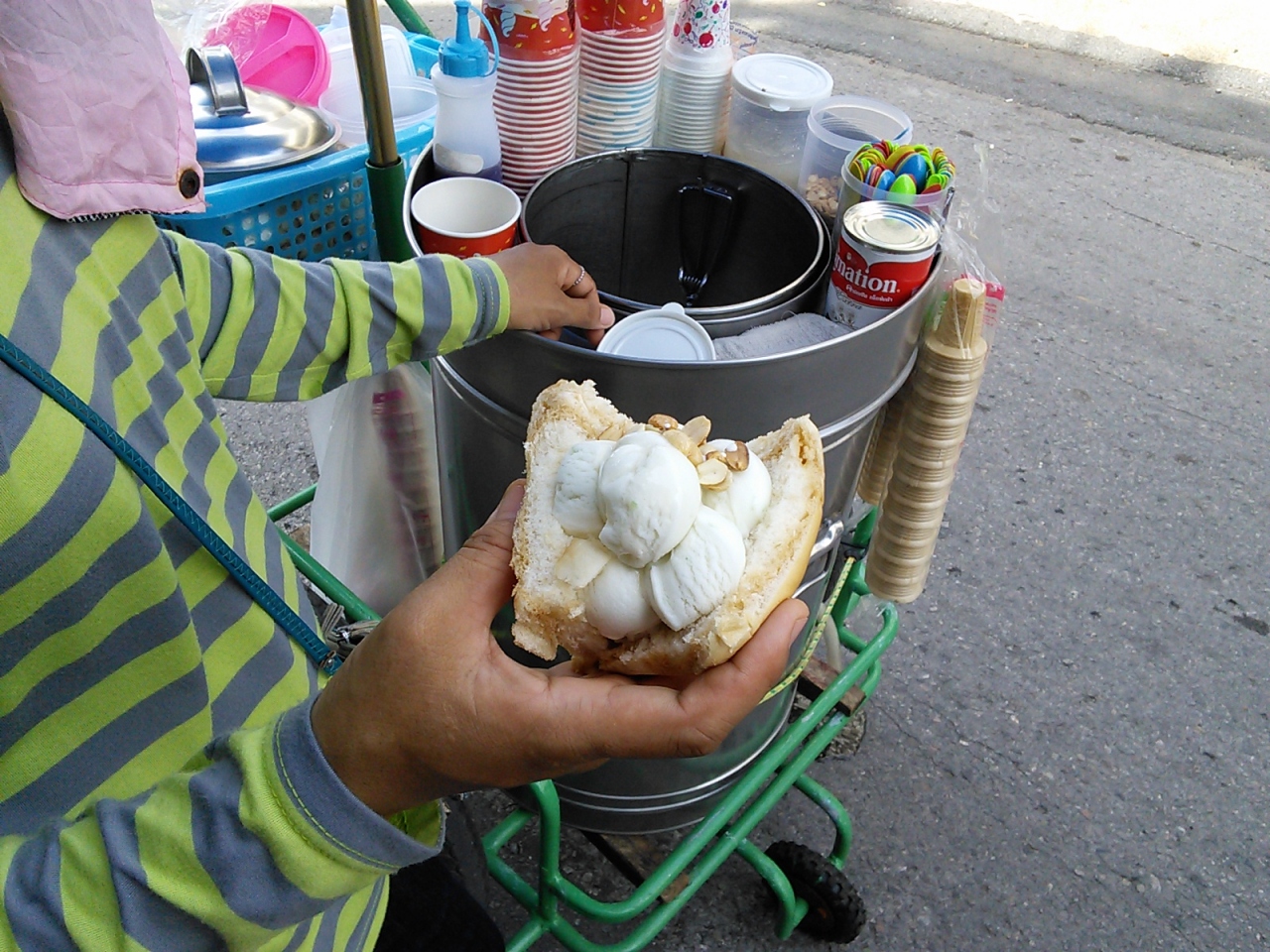 ぜひ、カップではなくもち米といっしょにパンに挟んでもらってください。ピーナッツやチョコレートもトッピングしてくれます。これで10B。かなりイケます。- 旅行時期