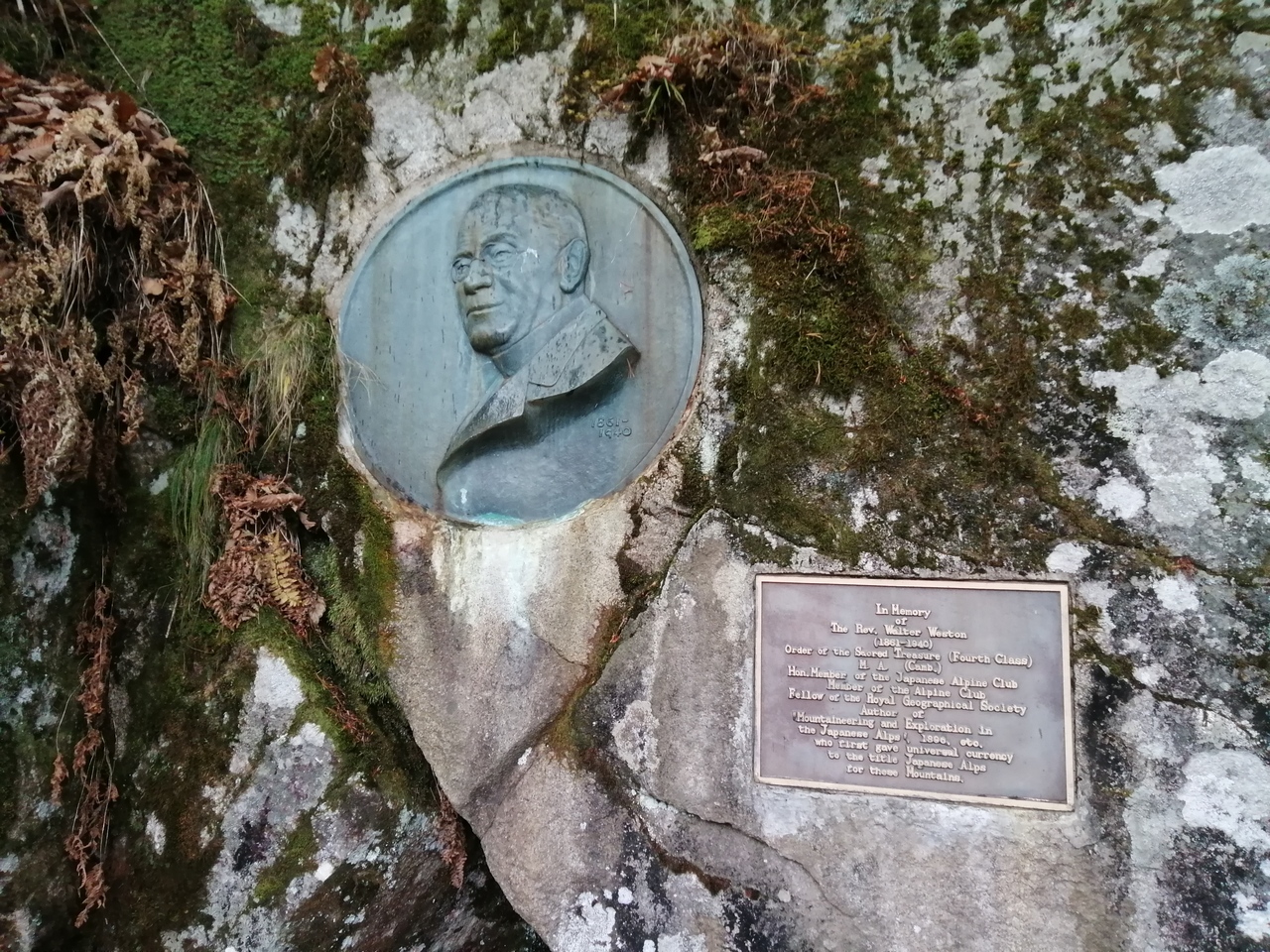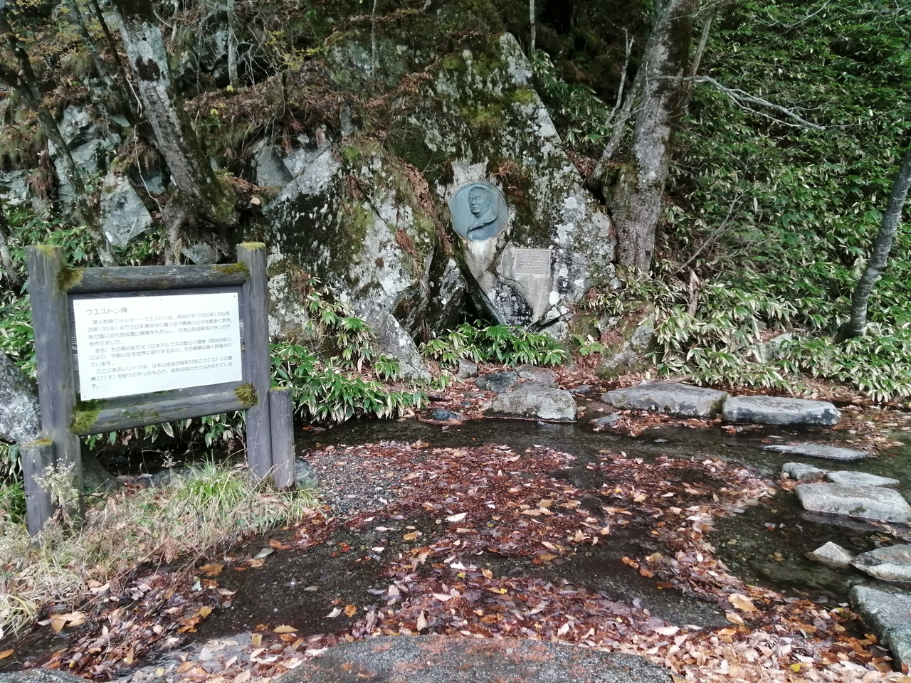 ウエストンとはイギリス人宣教師であり、登山家。上高地を世界に紹介したとされる人物です。氏の胸像のレリーフと岩に埋め込まれています。場所は梓川右岸、上高地温泉ホテルの上流約150m地点。