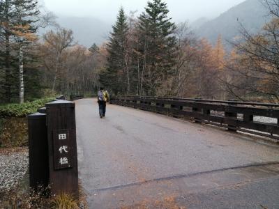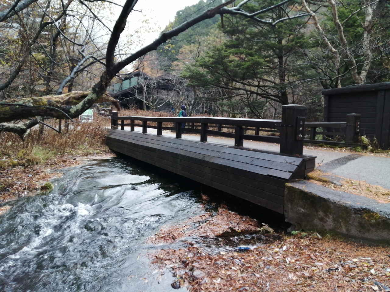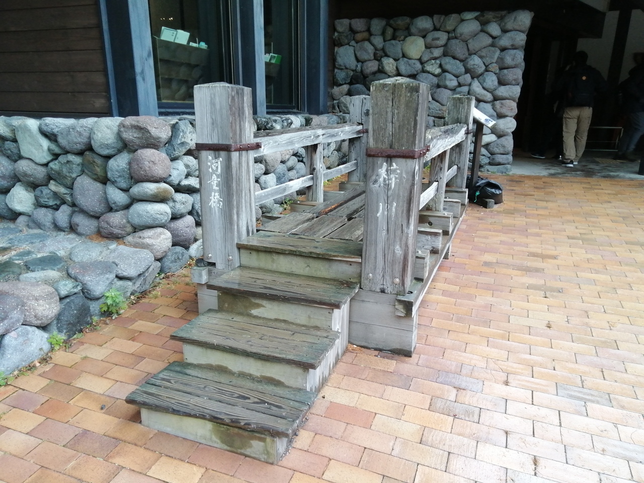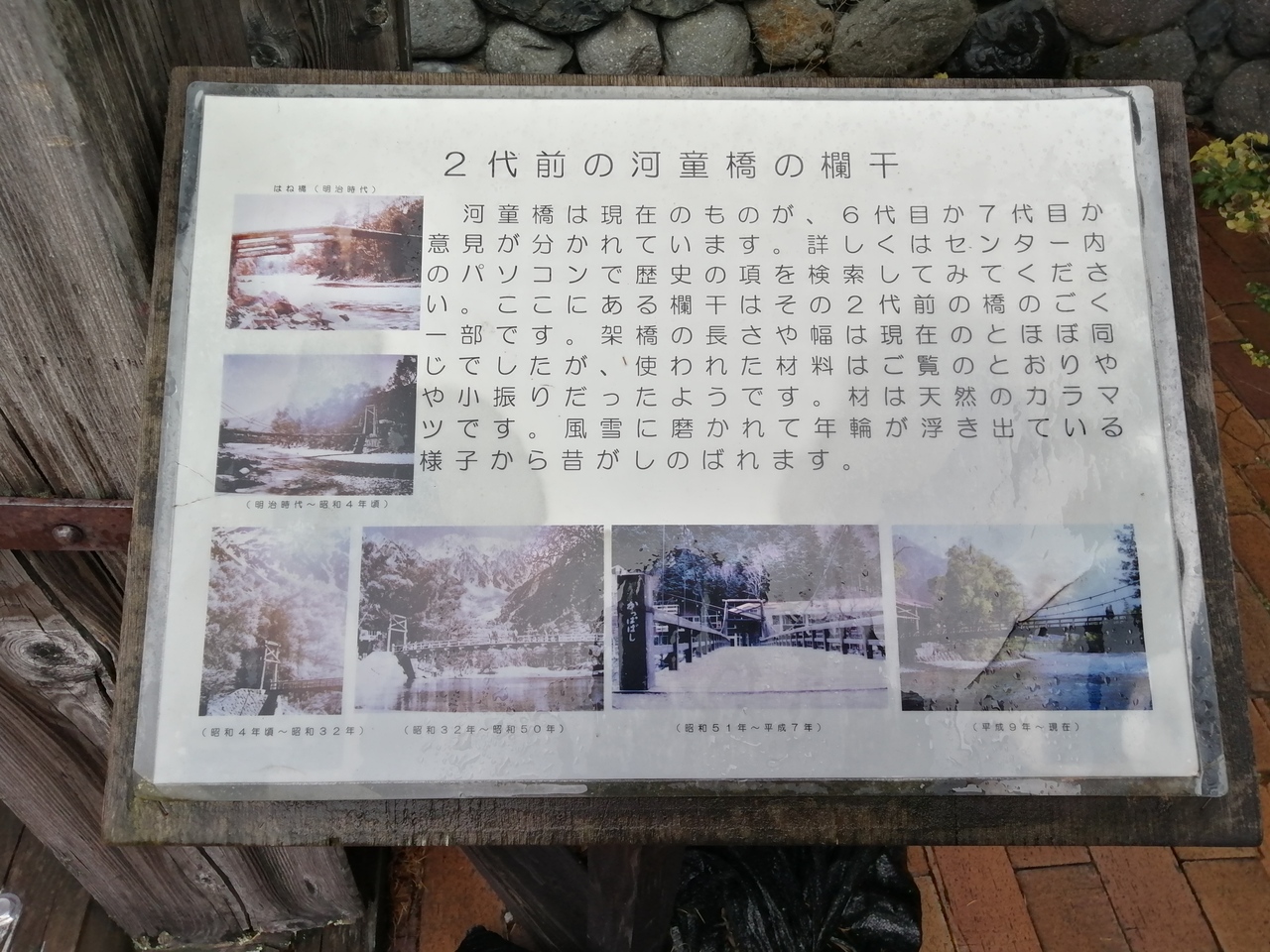 河童橋から梓川左岸を上流方面へ約150mの「上高地ビジターセンター」前に展示されています。最初に見た印象は…ちっちゃ。もちろん長さは短くしてあるものの、橋の幅はこのサイズかと思いました。しかし説明書きを見ると違うよう。長さ、幅ともに現在橋とほぼ同じだったそうです。そりゃそうか…。2代前というと昭和32年~50年までかけられていた橋となります。