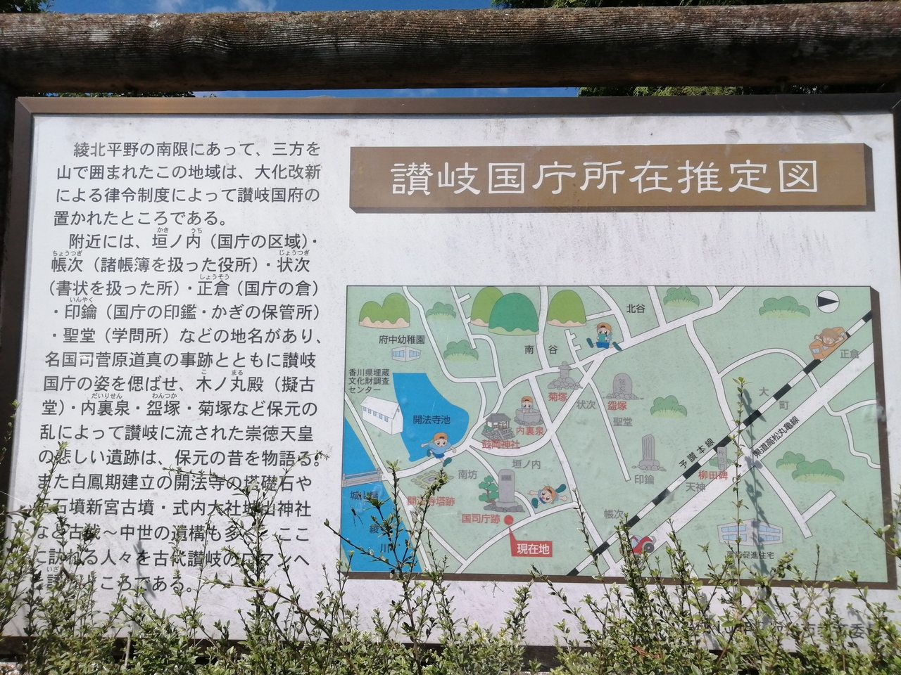 奈良~平安時代に置かれていた讃岐国府跡です。つまりは役所跡。住宅の点在する田んぼの一画に石碑と案内板が建てられているのみです。はっきりと正確な場所は特定されていないとのこと。周辺には関連施設の遺構が発見され、現在は発掘調査が進められているようです。その出土品は近くにある香川県埋蔵文化財センターに展示されています。