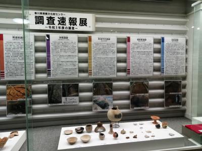 常設展として近くにある讃岐国府跡の発掘調査で出土した品々が展示されています。それだけでなく、香川県内の遺跡や古墳などからの出土品もあります。おそらく毎年行っているのだと思いますが、“調査速報展”と銘打ち、令和3年の活動実績が出土品と共に紹介されていました。県費を使って活動しているのですから、ちゃんと県民の方に成果報告し還元するのは当然のこと。素晴らしい姿勢だと思います。県外からやって来た私も無料で見ることができました。