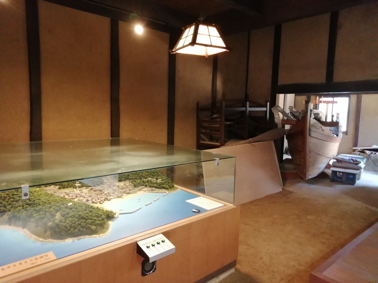 笠島まち並保存センターである真木邸の向かいにあります。江戸時代の廻船問屋の建物です。資料館となっていて無人でしたが内部を見学させてもらいました。あまり整頓されていませんでしたが、古民具や古文書、笠島地区のジオラマや木製の船などがありました。