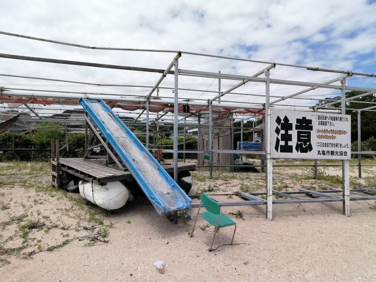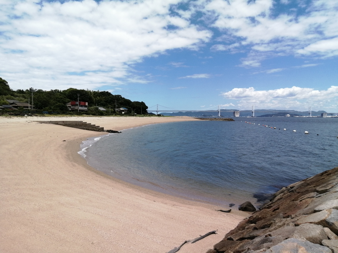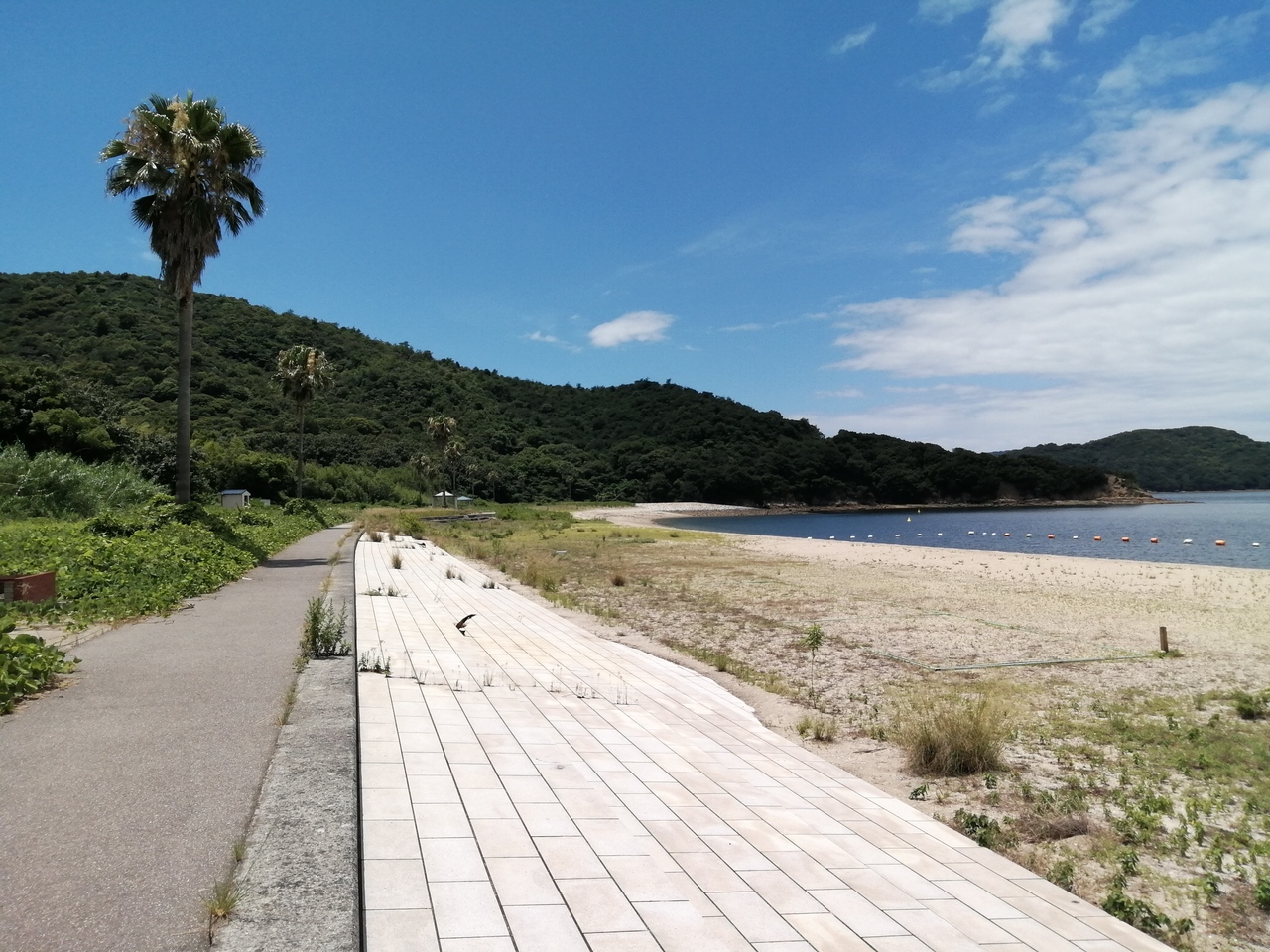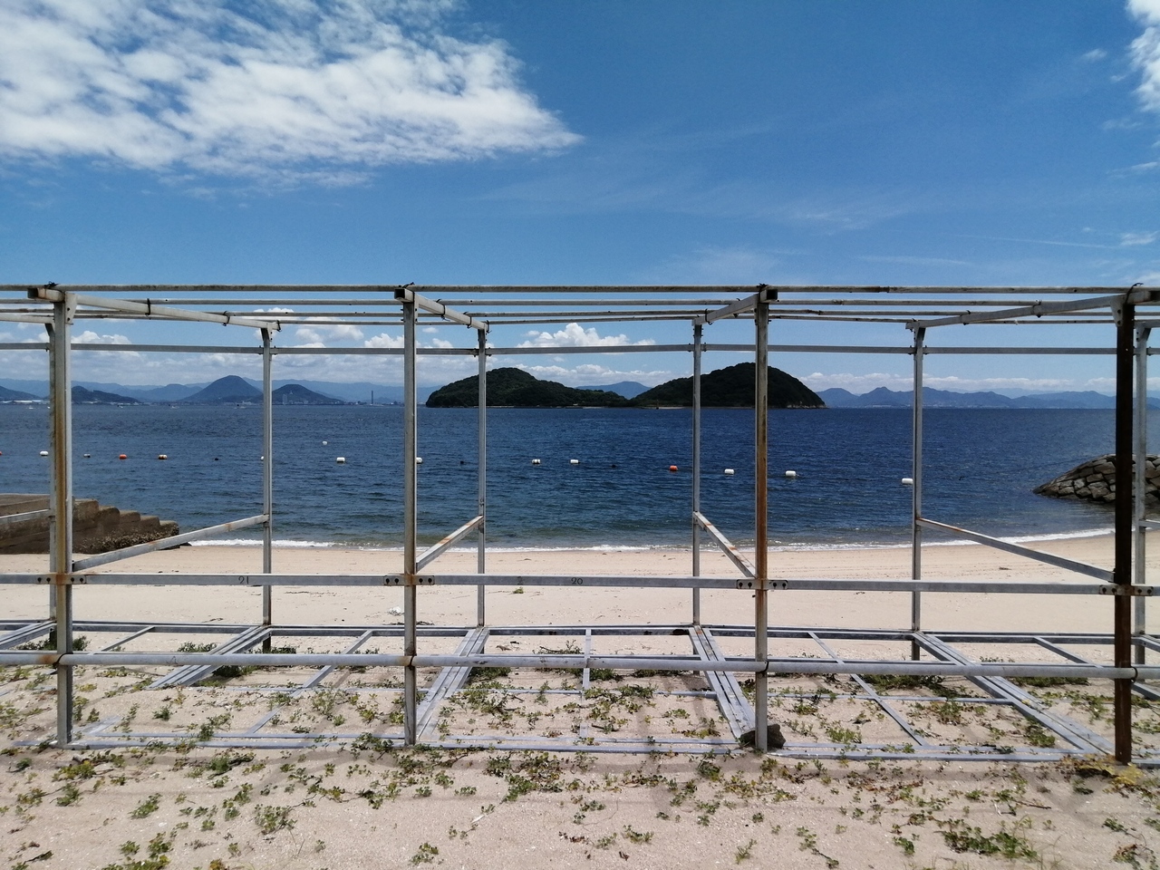 本島フェリー乗り場の西、徒歩5分のビーチです。7月下旬の天気のいい日なのにだーれもおらず。休憩所だったようなところに水上滑り台の残骸が放置され、退廃的な雰囲気が漂っています。水はそこそこきれいで、瀬戸大橋も眺められる。開放感のあるビーチです。