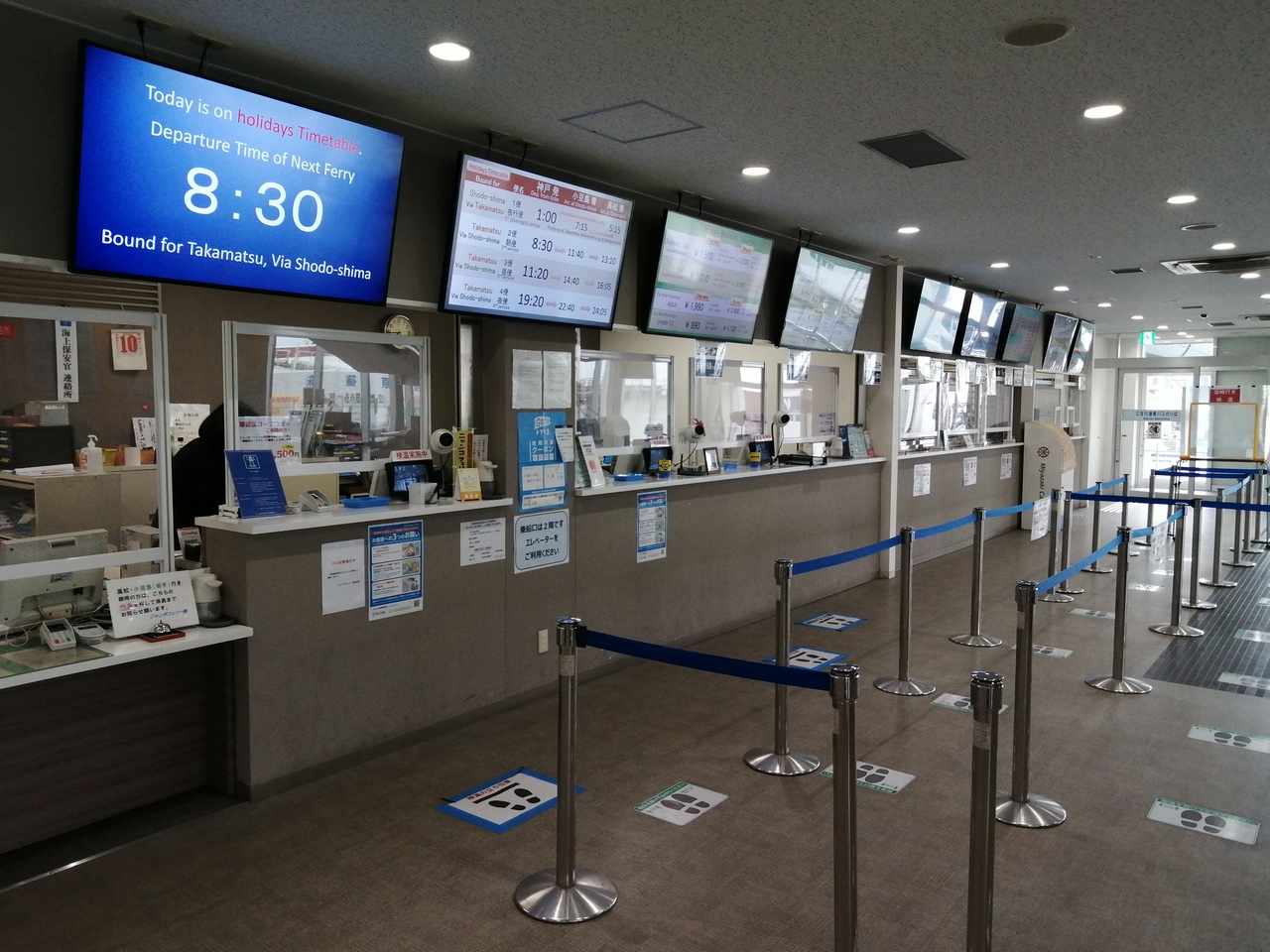 神戸から高松までジャンボフェリーを利用しました。ウェブサイトから予約できますが、“徒歩”だったので予約の必要はなし。乗船当日、乗り場である神戸三宮フェリーターミナルに出向きチケットを購入しました。大人片道2490円。神戸発8:30→高松着13:20、10分遅れの所要4時間50分でした。閑散期につき乗客の数は少なく船内では快適に過ごせました。到着後は高松駅まで無料の送迎バスがありました。