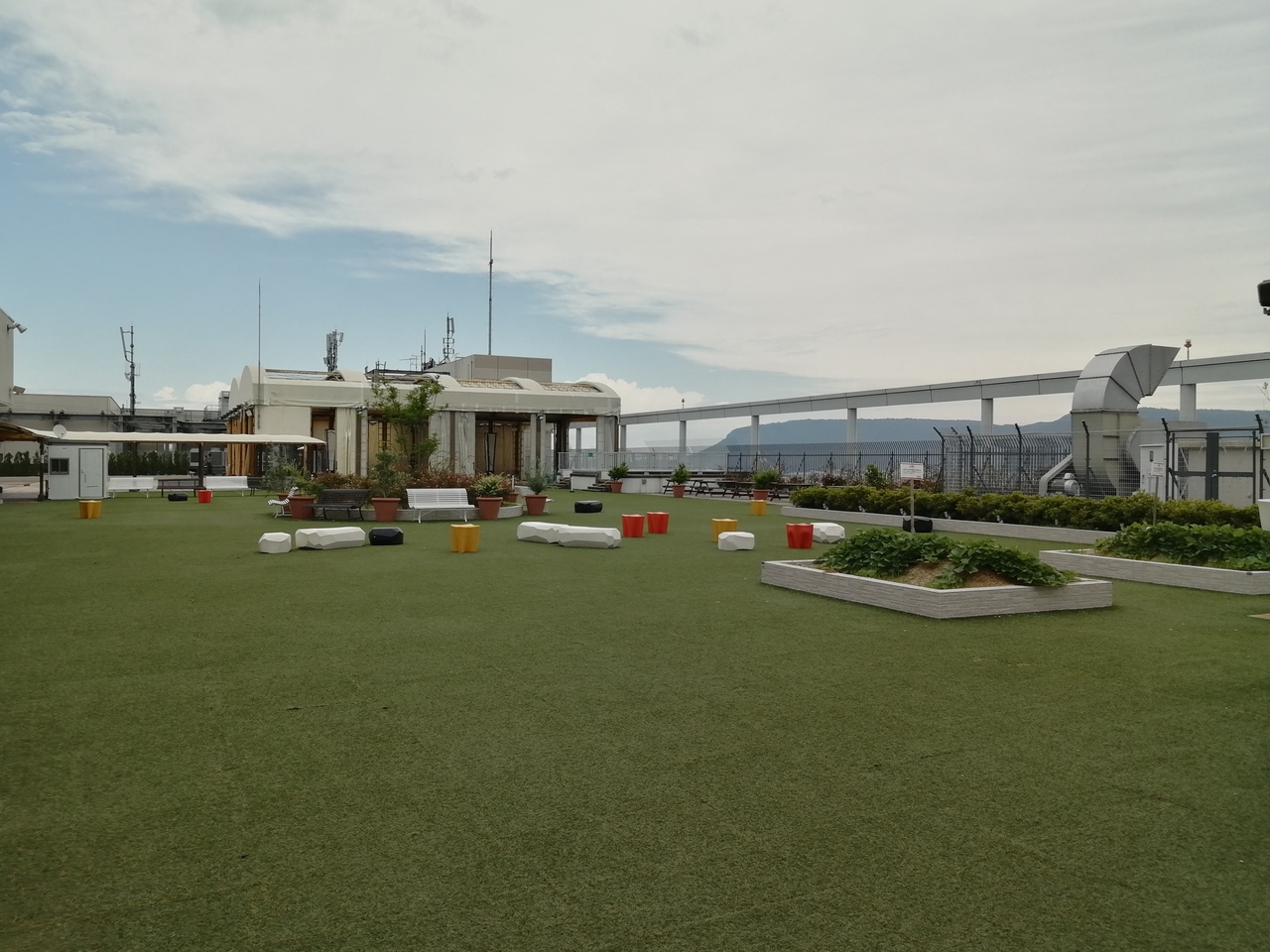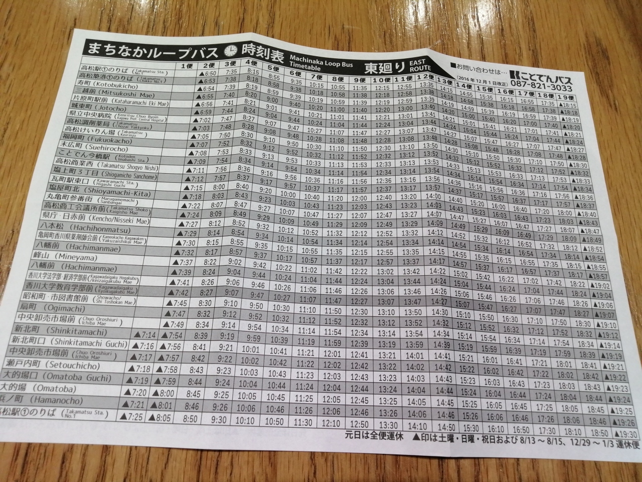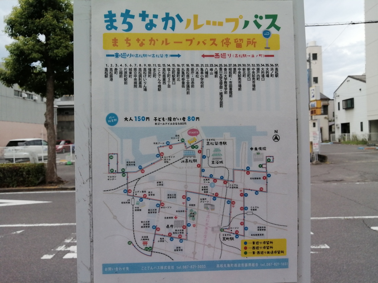 物は試し。琴電瓦町駅から高松駅までこの“ループ”バスに乗ってみました。西周りと東周りがありますが、敢えて遠回りになる東周りに乗車。バス停は瓦町駅東口(裏側)にあります。赤の緑のレトロチックなバスがよかったのですが、水色の味気ないバスでした。
