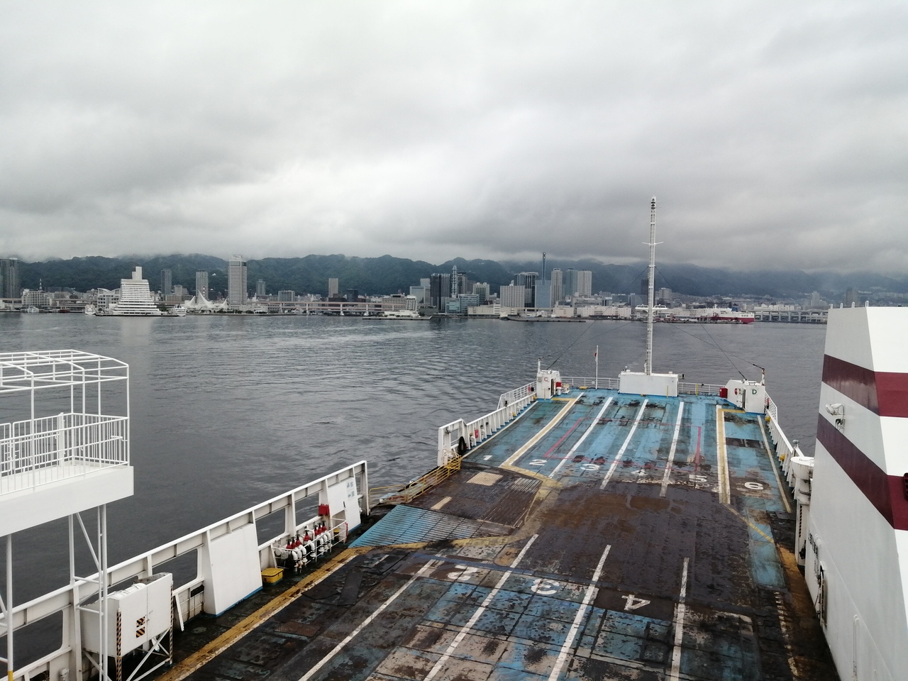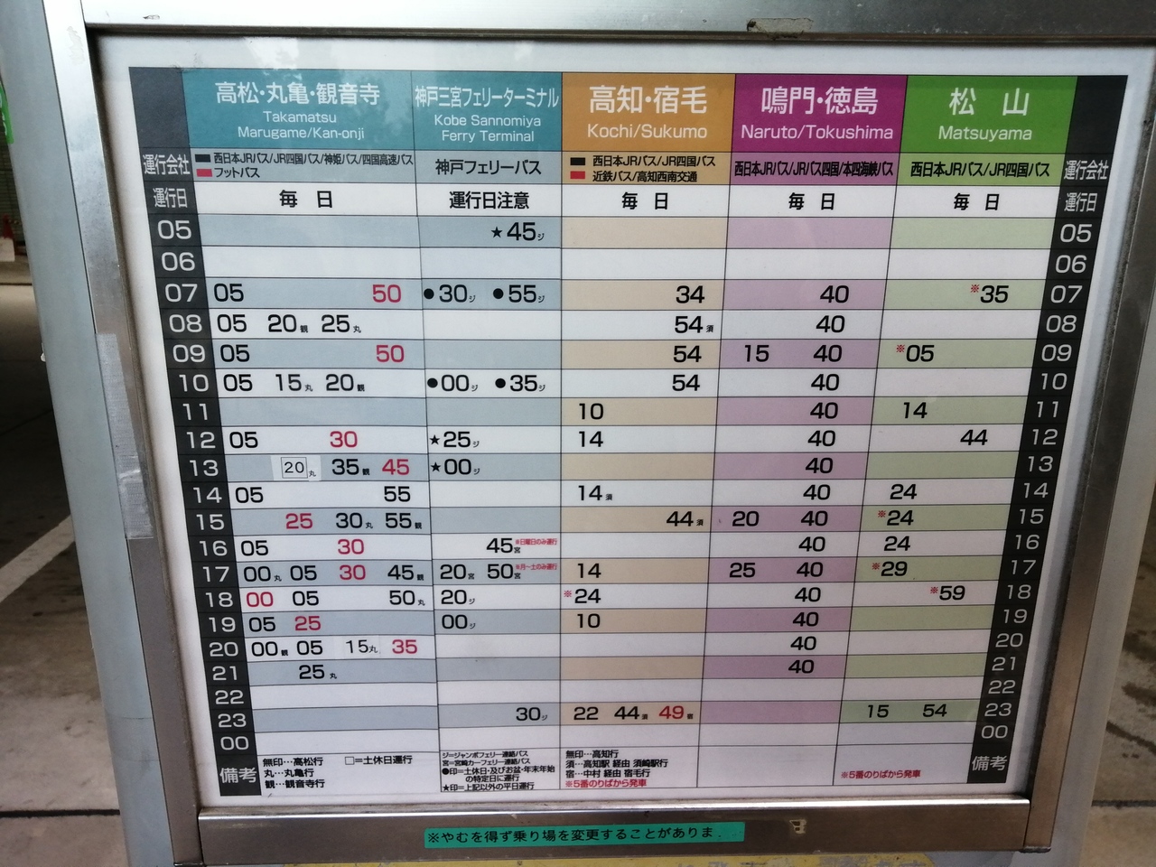 神戸三宮フェリーターミナルから高松までジャンボフェリーに乗りました。三宮駅からフェリーターミナルへは「ミント神戸」1階のバスターミナル6番乗り場からバスが出ています。所要約7分、210円。24:30発のフェリーに限ってはバスの乗り場から異なるので注意が必要です。