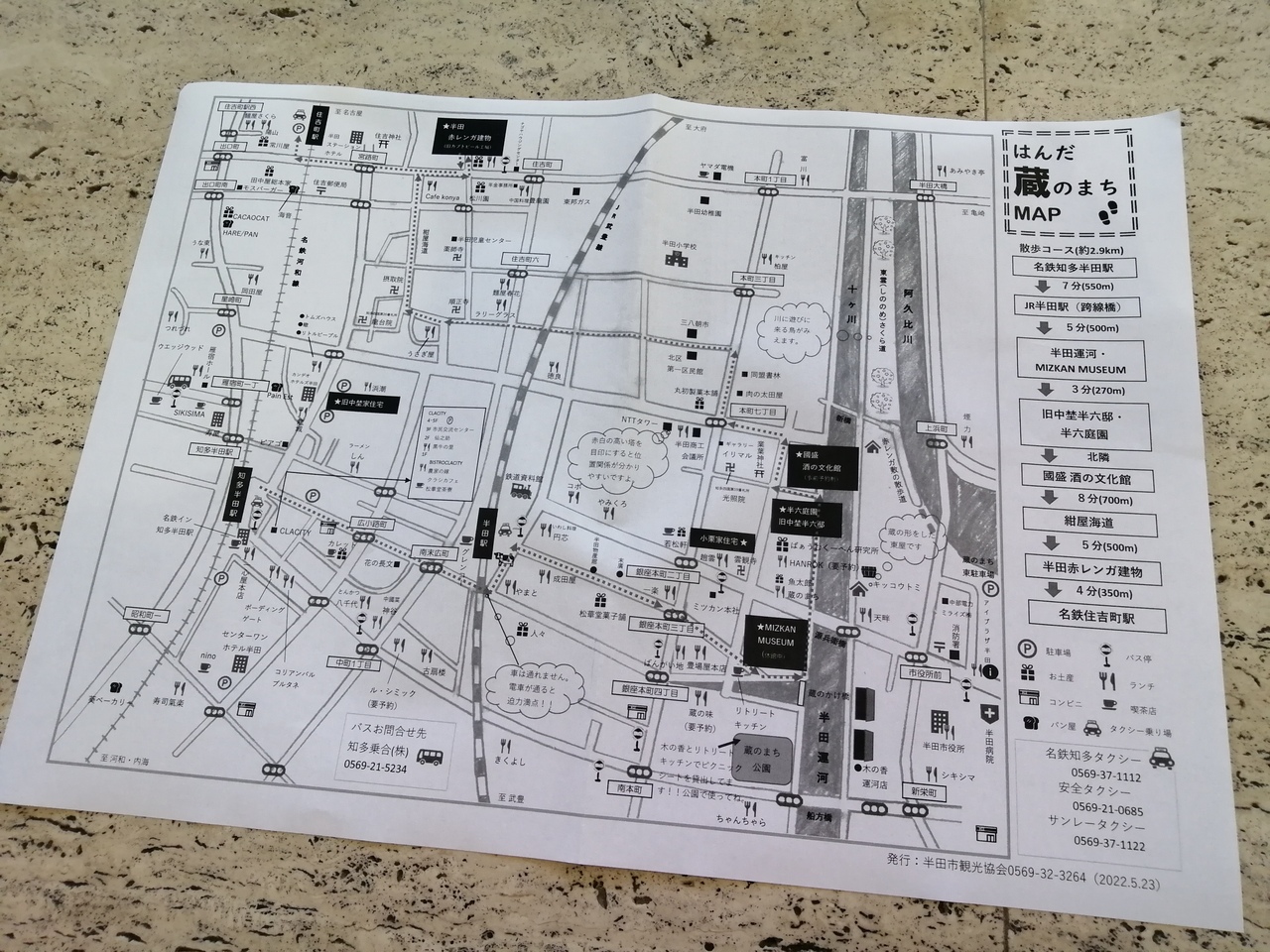 半田市役所の向かい、消防署の隣りにある「アイプラザ半田」という多目的施設1階に入っている市営観光案内所です。取ってつけたような小さな案内所ですがスタッフが1人常駐しており、パンフ類と、A3サイズのかなりデカい手作り観光マップが手に入ります。