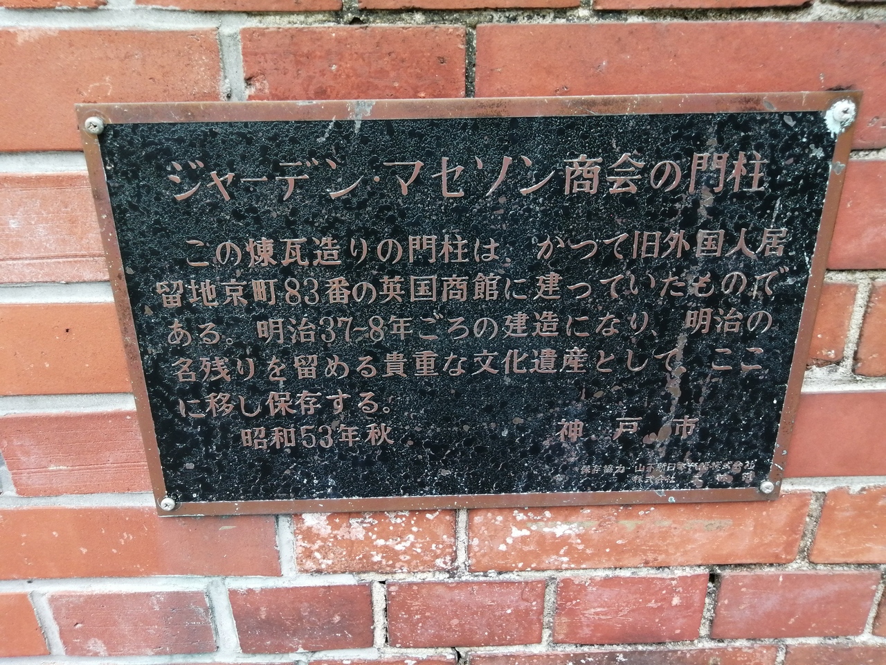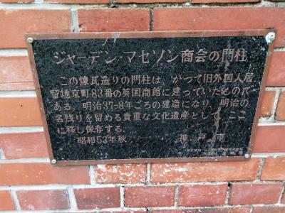 かつて三宮駅と神戸港の間の旧外国人居留地にあったジャーデンマセソン商会(旧英国商館)の門柱を移築したものです。レンガ造りで味わい深いものですが、なにせ門柱だけなのであまり見応えはありません。- 旅行時期