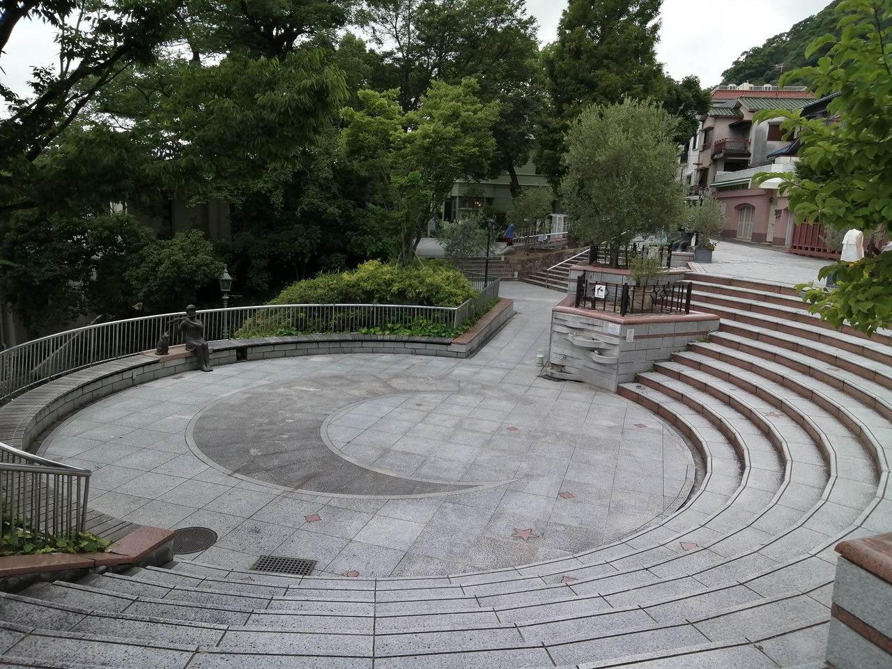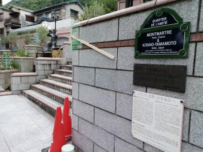 神戸の北野山本地区とパリのモンマルトル。共に高台に位置した街であり、芸術文化が根付き、住宅地と観光地がうまく調和しているという共通点があるため、2005年に有効提携が結ばれたようです。それを示す銘板です。北野町公園のほぼ中央、円形サークルとトランペッター像の間にあります。