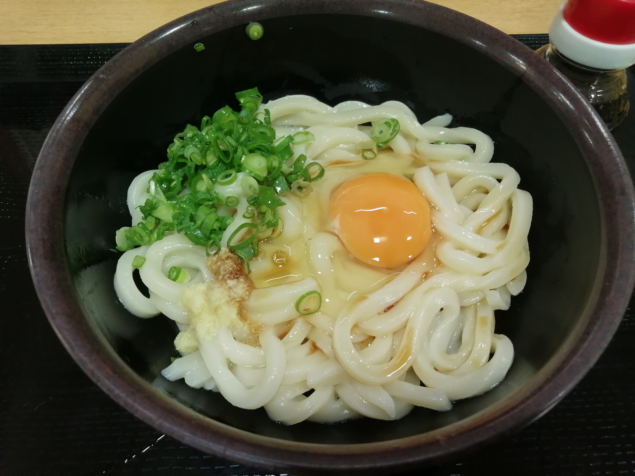 月曜朝8:00に訪店。店内はとても広く、客は数人でガーラガラでした。釜玉うどんをオーダー。タイミング悪く茹で中で6~7分待ちました。ねぎと生姜をセルフトッピング。茹でたて熱々の麺の上には生卵。しょう油を2周かけ、混ぜ混ぜ。そして一口。うまーい。これほどシンプルでこれほどうまい食べ物はあるでしょうか。いや~最高でした。