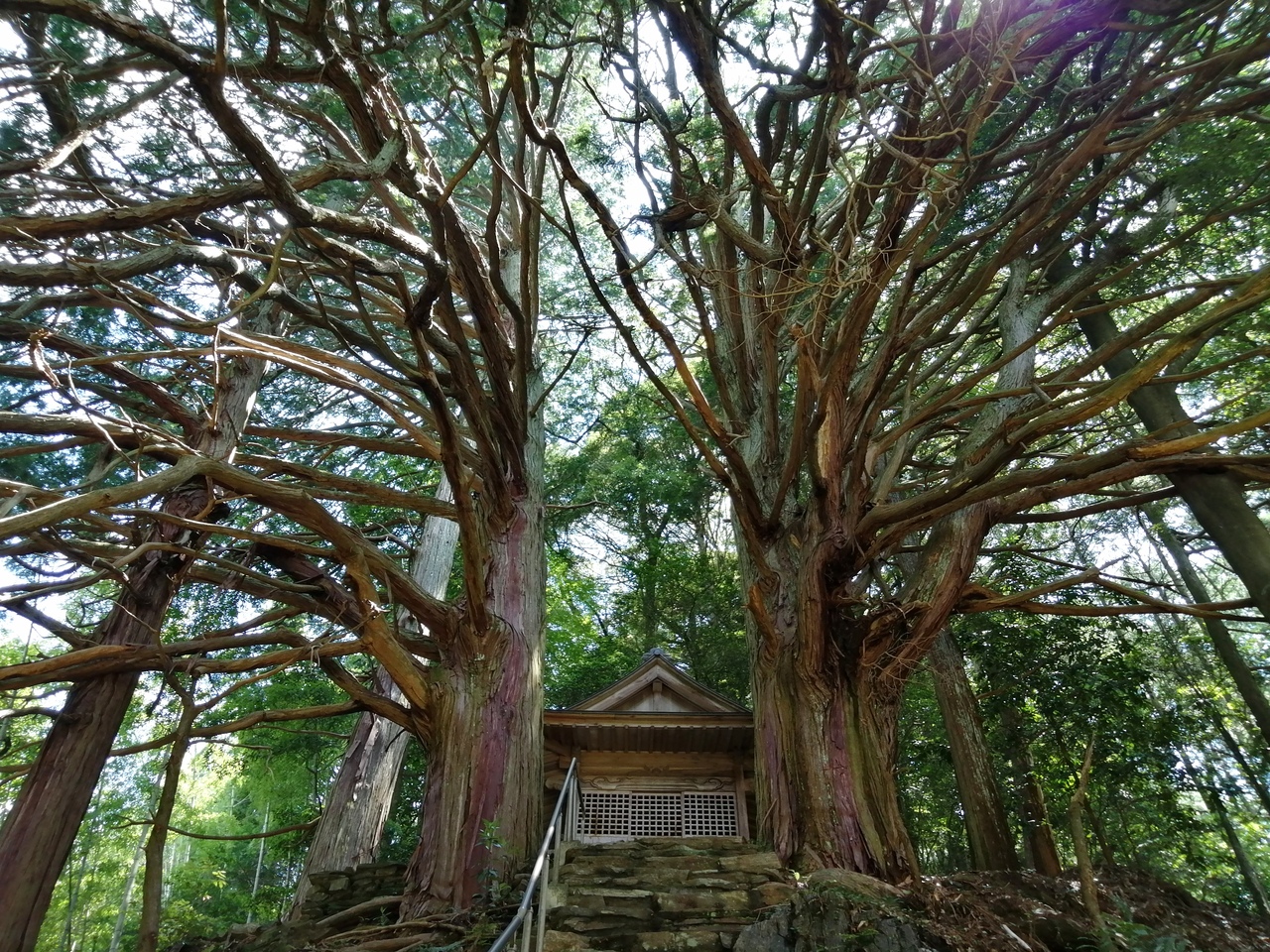社の参道である階段から見上げると凄まじい光景が目に入ってきます。まるで1本の木を中心から切り裂いたかのような一対の巨木。手を広げたかのように広がる枝振りは異様な姿です。存在感が半端ない。斜面に露出した根は他の木々の根と絡み合いえらいことになっています。
