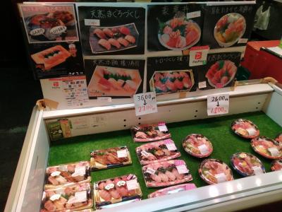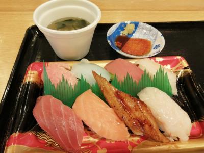 1200円→1100円になっていたパックの“極上”握り寿司を購入。この場で食べればみそ汁が付きます。スーパーのものよりはちょっと豪華かなと。大トロも入っていました。おいしいだけにもっと食べたい。これ1個ではボリューム的にはやや物足りなさはありました。- 旅行時期