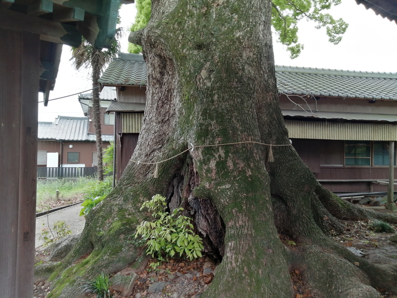 旧東海道赤坂宿の街道沿いにあります。小さな神社ですが、お堂脇に立つクスノキがデカいです。幹もぶっとく、かなりの存在感を放っています。推定樹齢はなんと800年。いったいどれだけの旅人を眺めて来たんでしょうか。歴史のロマンを感じます。境内には松尾芭蕉の句碑もあります。
