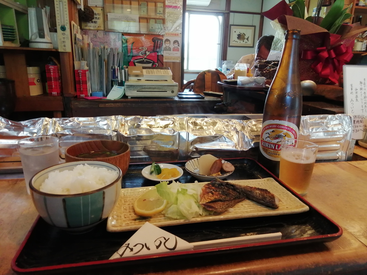 ランチ(税込900円)をいただきました。メインはサバとメヒカリの塩焼き。蒲郡名産のメヒカリ初めて食べましたがふわふわでとてもおいしかったです。それとおでんの大根とウインナーが一切れずつと味噌汁。ですが、この量で900円だとお得感はあまりないかなと思います。ビール大瓶710円もちょっと高い。