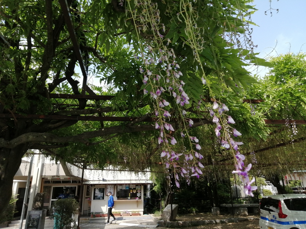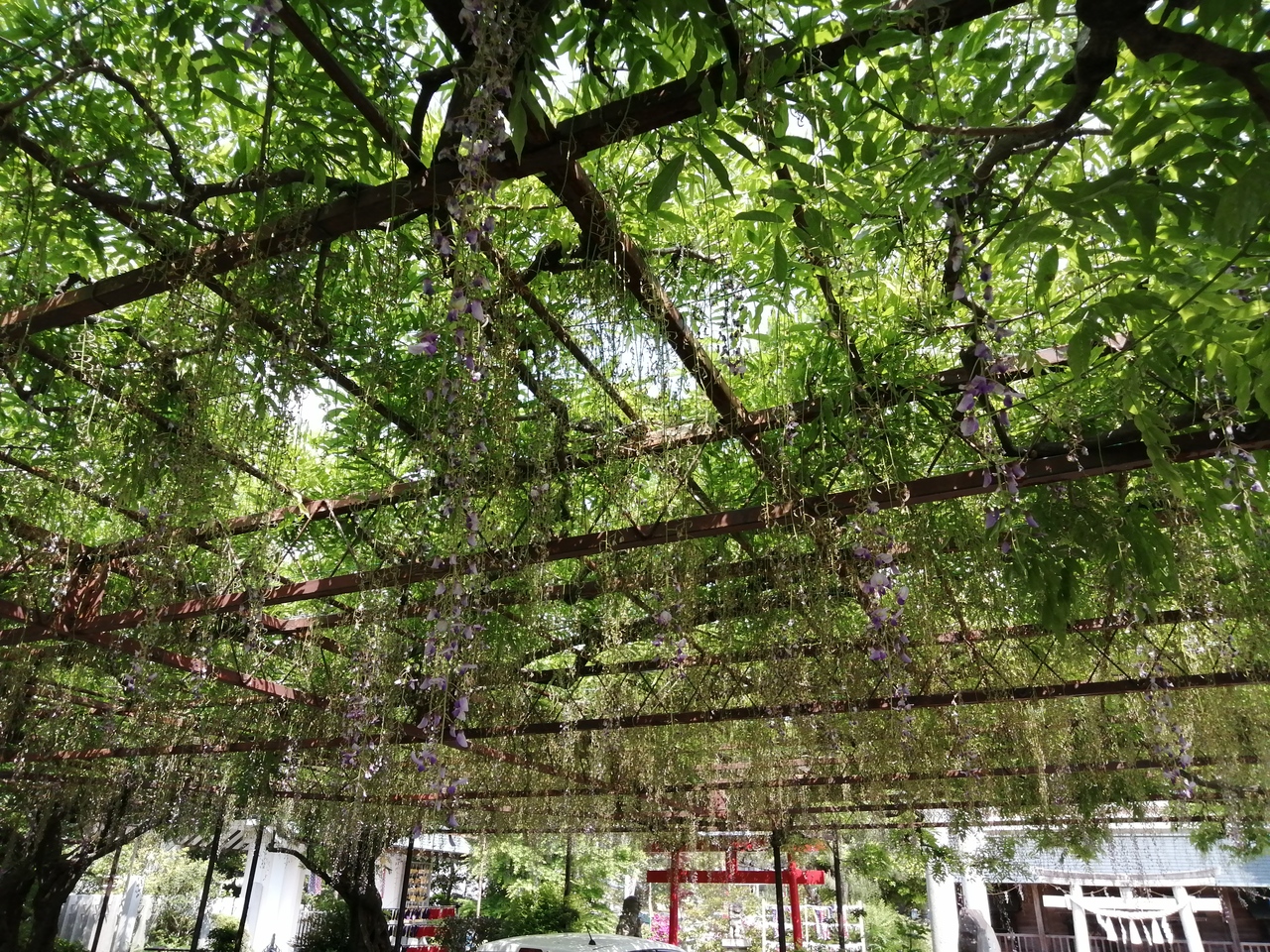 「長藤」の名所でもあります。もうそろそろ見頃かなと思い、出かけてみると…え、まだ?と思ったのもつかの間、すでにほぼ散り果てでした。巫女さんに尋ねたところ、先週が見頃だったとのこと。例年に比べると今年はずい分早かったようです。残念。やはりベストな状態を見たいなら、手間暇かけて事前のチェックはマストですね。改めて思いしらされました。