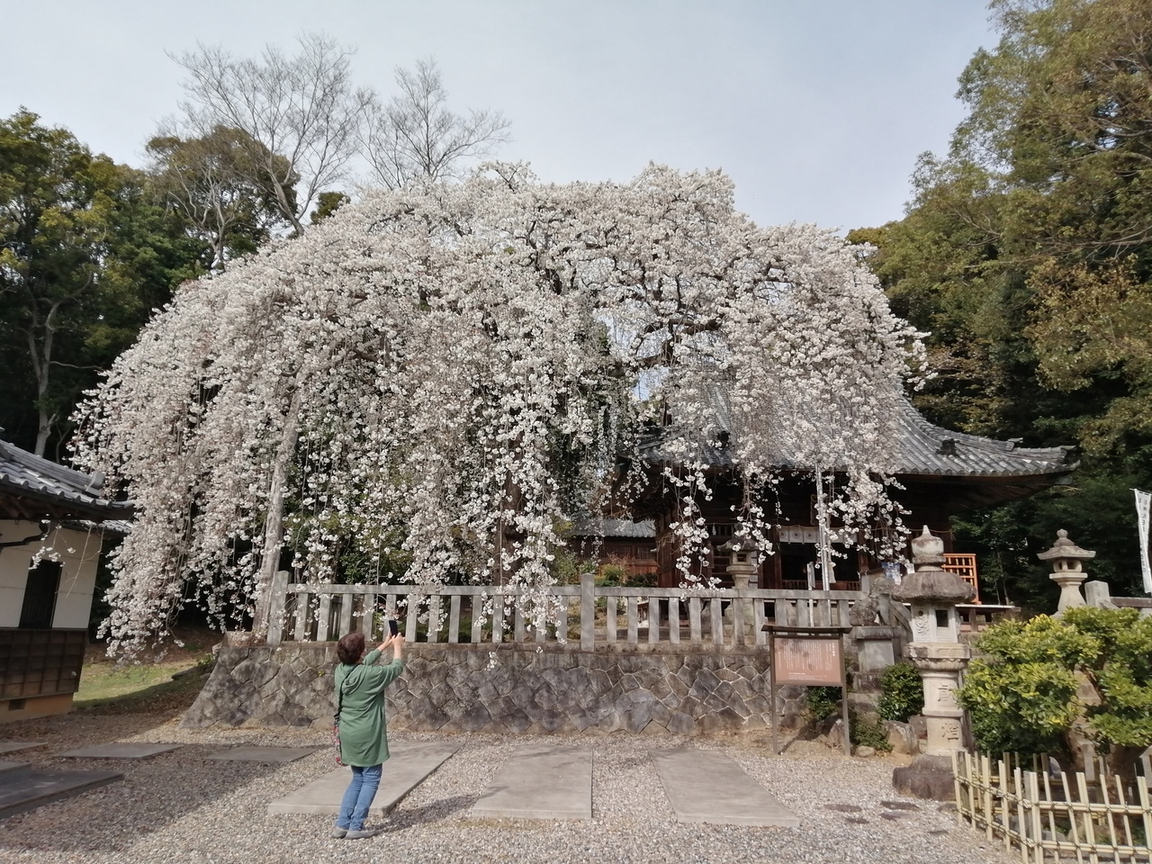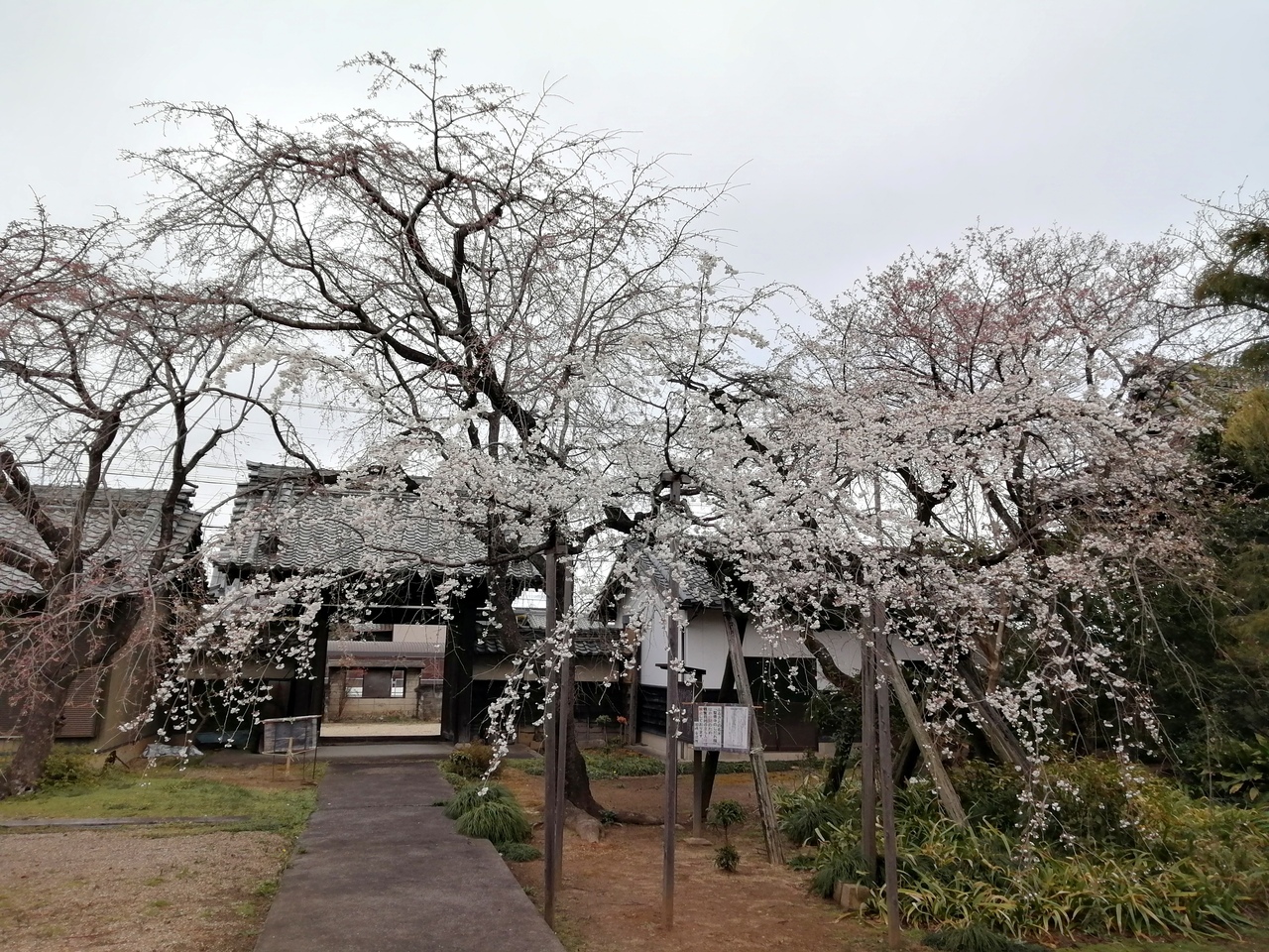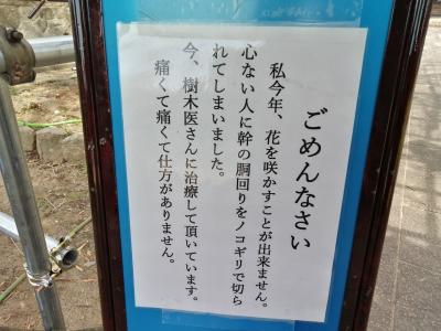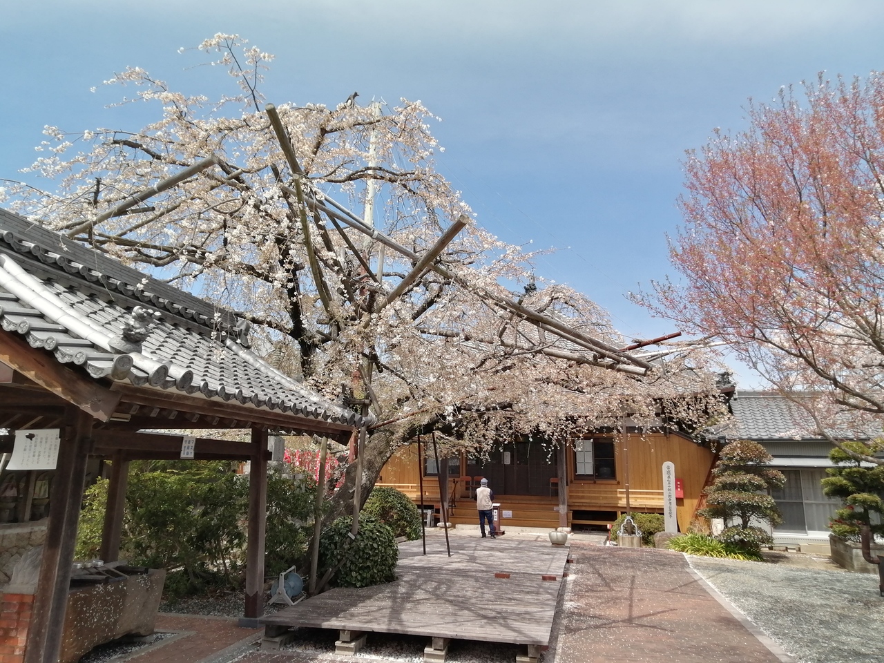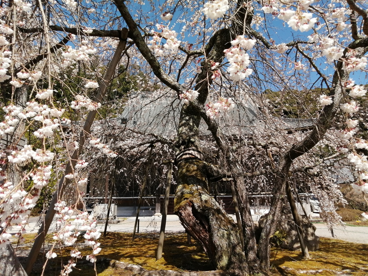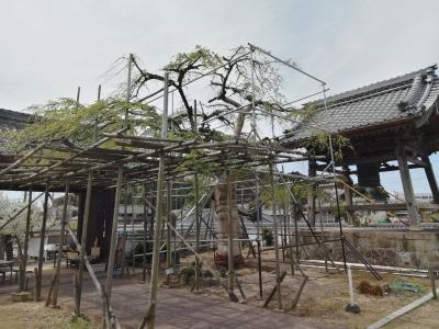 樹齢約300年のしだれ桜があります。やや見頃のピークは過ぎたかなと思いつつ、訪れてみると…すでに花はなく新葉のみ。でもなんか様子がおかしい。山門前で露店を出している方に尋ねると、何者かにのこぎりで幹を切られ今年は咲かなかったという。幹周りをぐるりと一周切られていたそうです。こんな酷いことをする人がいるなんて驚きです。ちょっと怖くなりました。もちろん警察に通報し地元のニュースにもなりました。現在は樹木医に治療してもらっているようです。