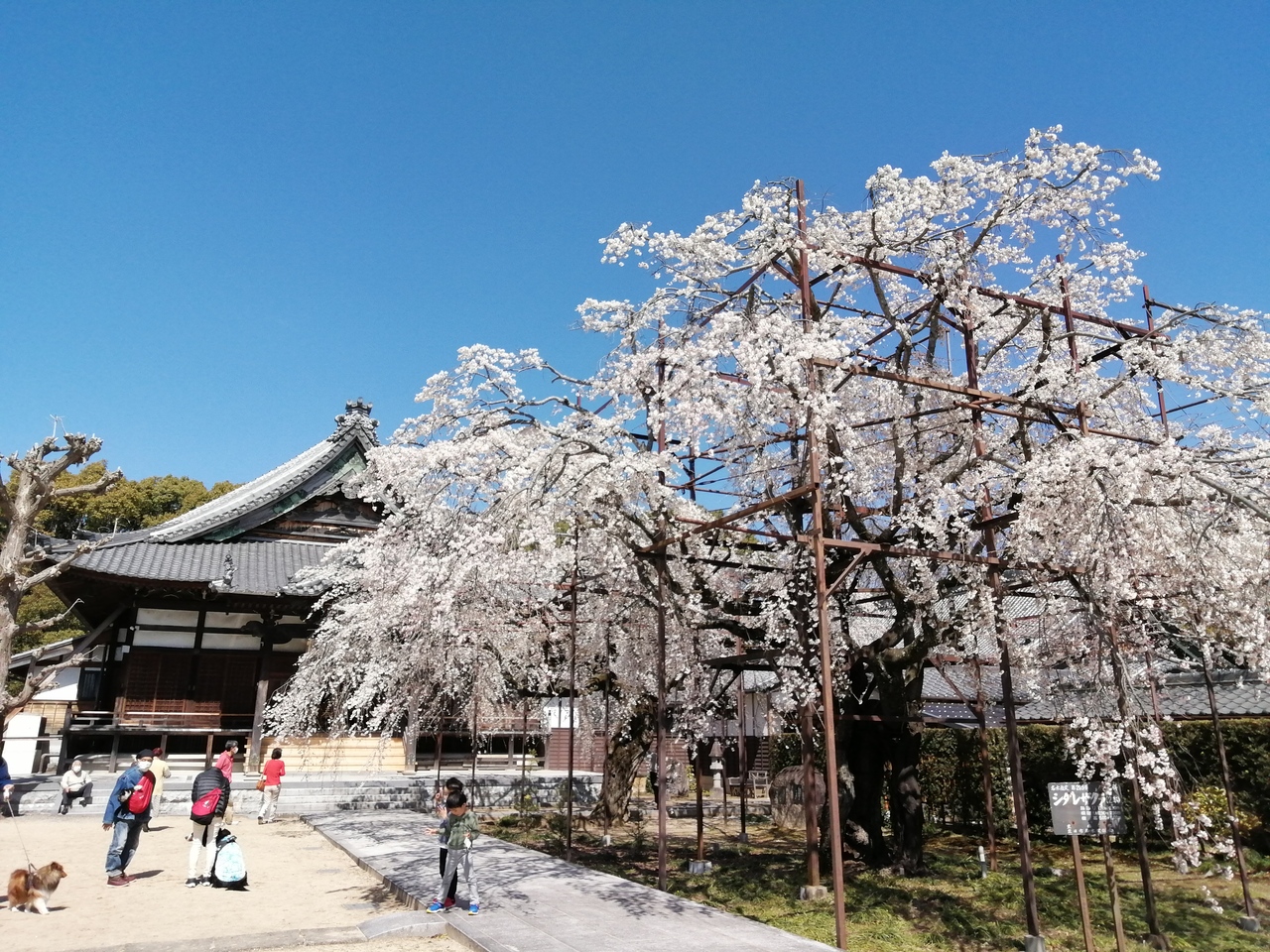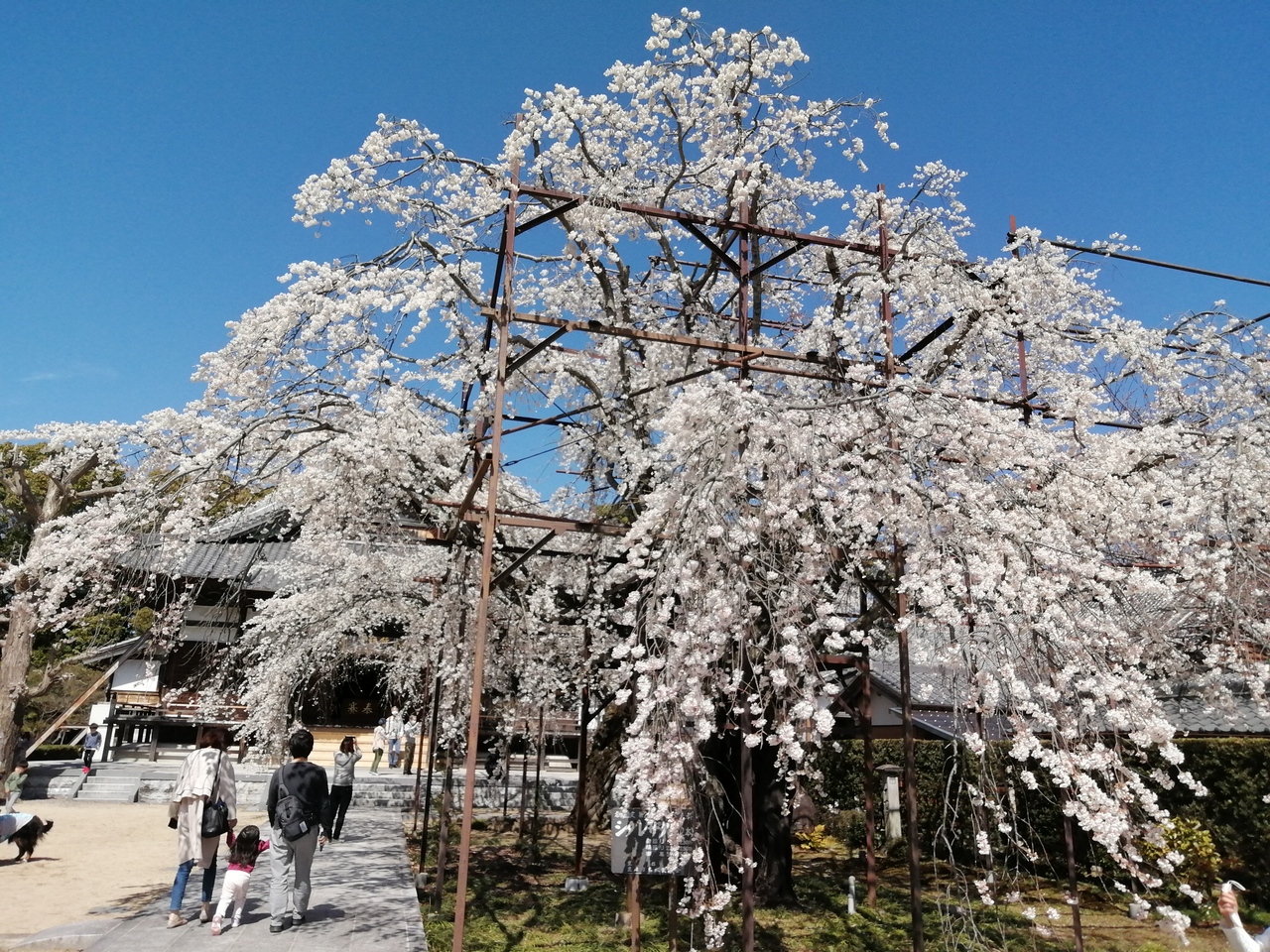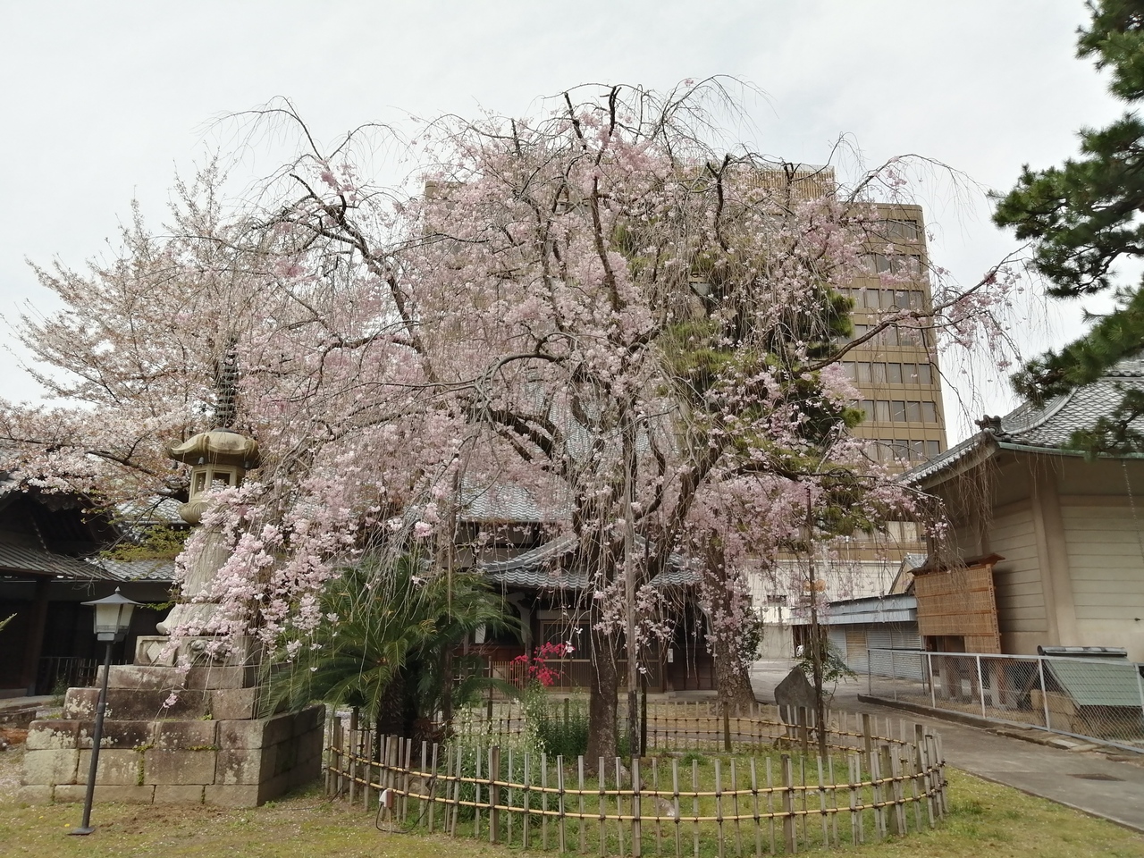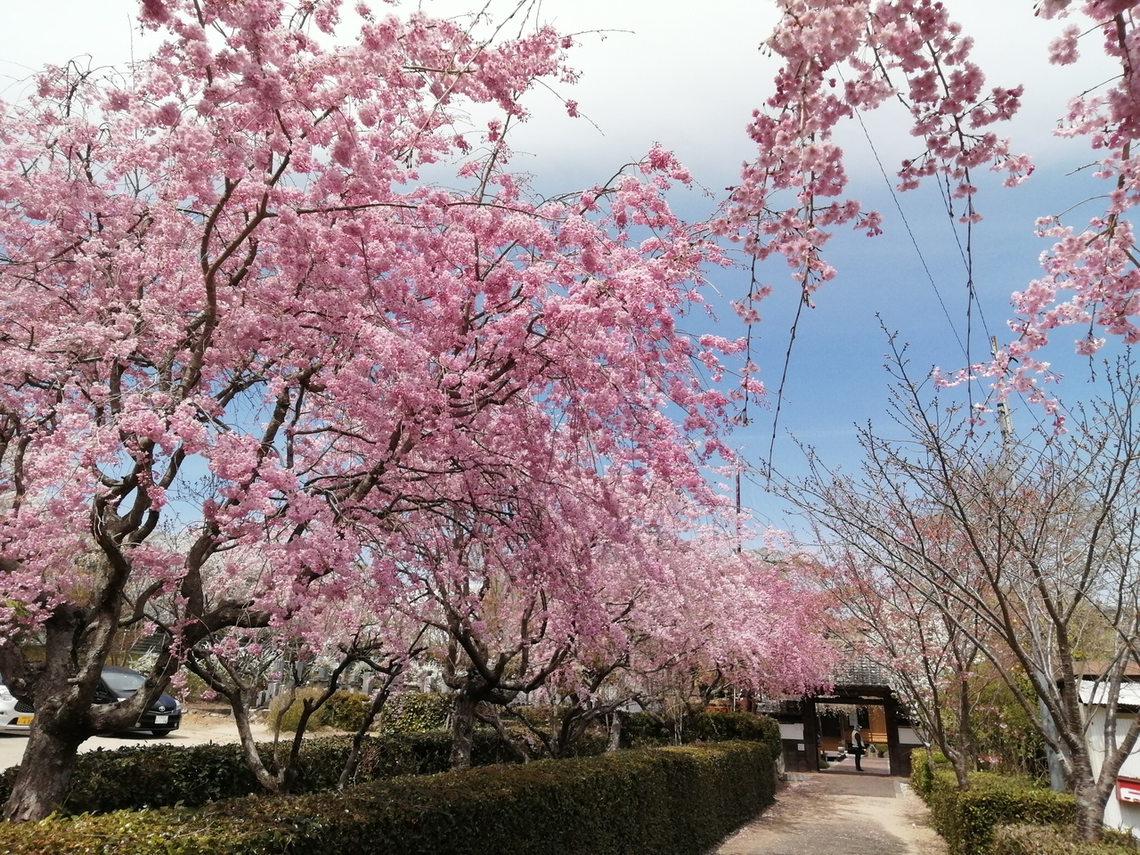 樹齢約300年のしだれ桜があります。やや見頃のピークは過ぎたかなと思いつつ、訪れてみると…すでに花はなく新葉のみ。でもなんか様子がおかしい。山門前で露店を出している方に尋ねると、何者かにのこぎりで幹を切られ今年は咲かなかったという。幹周りをぐるりと一周切られていたそうです。こんな酷いことをする人がいるなんて驚きです。ちょっと怖くなりました。もちろん警察に通報し地元のニュースにもなりました。現在は樹木医に治療してもらっているようです。