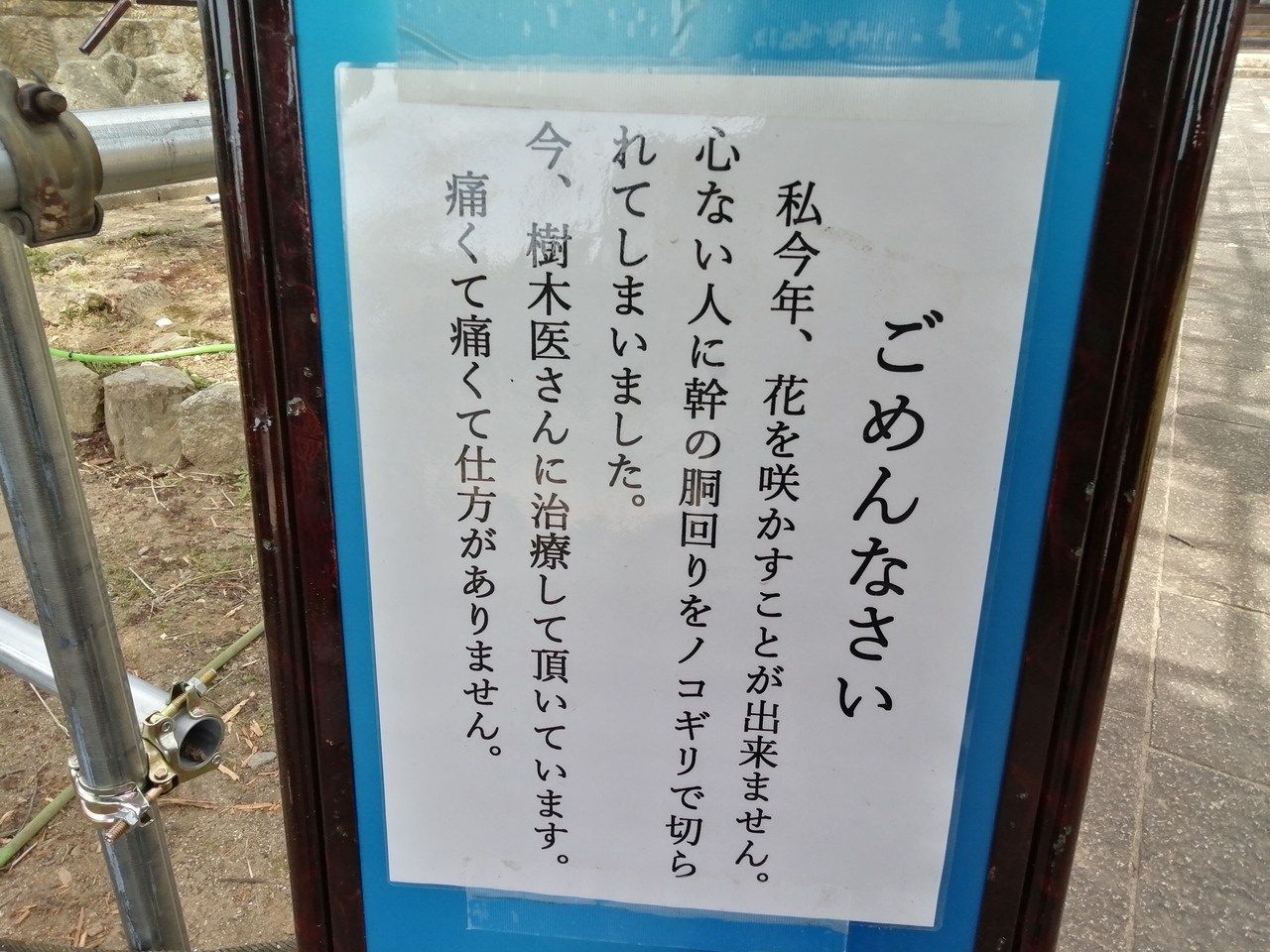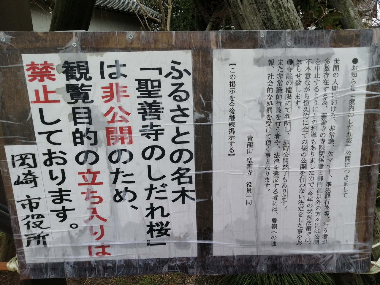 岡崎市の「ふるさとの名木」にも指定されている枝垂れ桜があります。3/19、まだちょっと見頃には早いかなと思いつつ近くを通りかかったついでに立ち寄ってみました。意外にも4分咲き程度でなかなかの美しさでしたが、ふと、とある看板が目に入りました。それは岡崎市役所による「枝垂れ桜は非公開のため立入禁止」というもの。詳しく読むと寺側としては見学者のマナー違反のため今年の状況次第では恒久的に公開を行わないとのこと。その文面からはかなりの憤りが感じられます。こんな状況にまでなるマナー違反(準犯罪行為)とはいったいなんなのでしょうか。普通に桜を見れない方がいるとはちょっと信じがたいです。こんな一握りの方のために桜が見られなくなるのは悲しいですね。