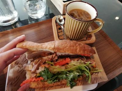 「バン・ミー・タップ・カム」(税込650円)を注文。ベトナム風の“具材いろいろ”のサンドイッチです。バケットはパリパリで豚肉、ハム、なます、パクチーなどが入っていて抜群にうまい!完全にベトナムの味です。そのままでもおいしいですが、チリソースをかけてもおいしいです。