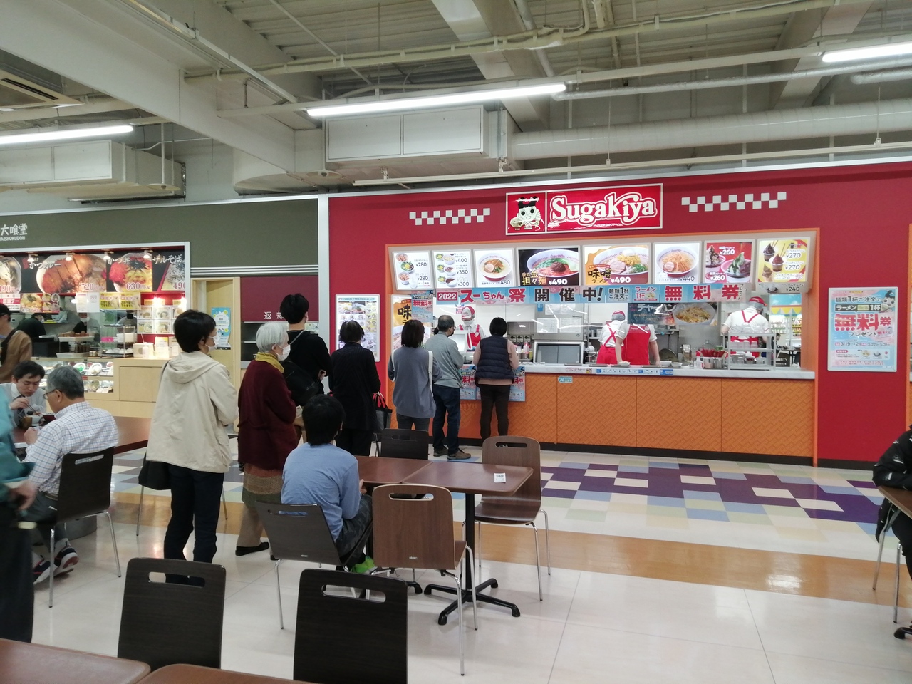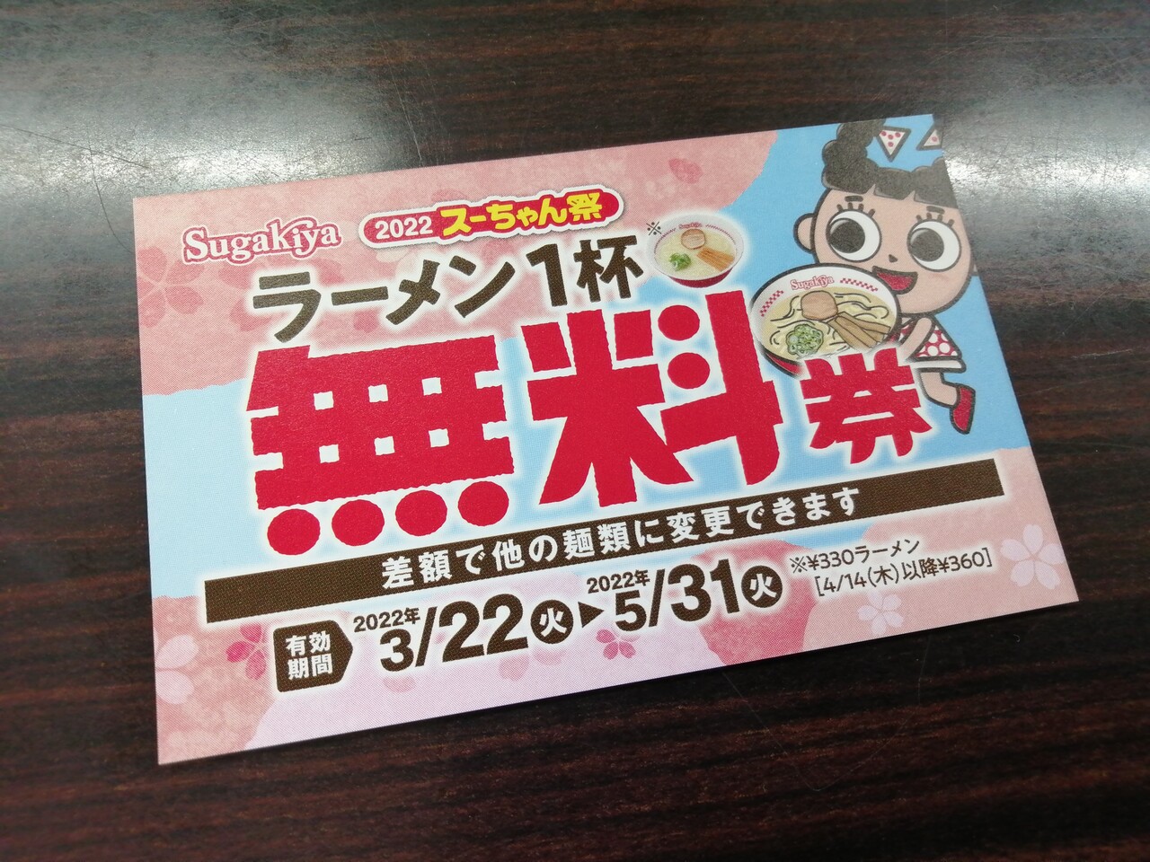 3/19~21まで開催されていた「スーちゃん祭」に参加してきました。と言ってもラーメンを食べに行っただけですけど…。なんとこの期間に麺類1杯注文すると「ラーメン(330円)」1杯の無料券がもらえるというキャンペーンです。この日は日曜日ということもあり、行列ができていましたが、無事無料券をゲットしました。5/31まで使えるとのことなので次回使いたいと思います。