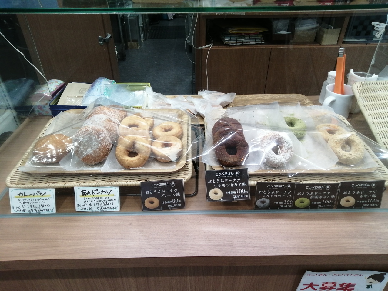 土曜の午後2時過ぎに訪れるとお弁当はほぼ売り切れでした。おやつとして「おとうふドーナツ」の抹茶きな粉味(100円+税)をいただくことに。抹茶味のきな粉がこれでもかというくらいにまぶされており、かなりおいしかったです。それにおとうふを使っているのでヘルシーでもあると思います。- 旅行時期