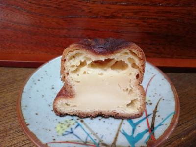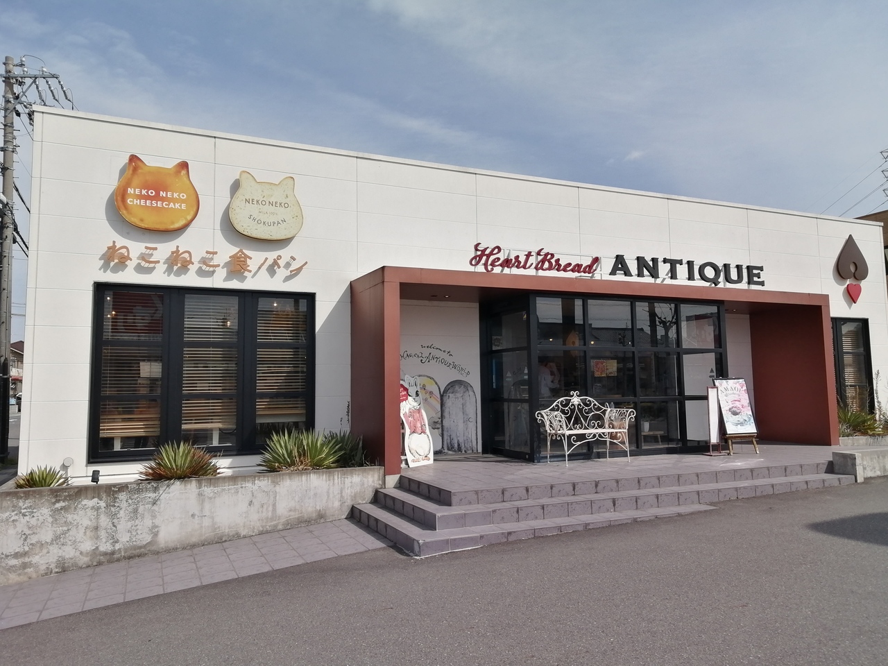 「ねこねこ食パン」、「ねこねこチーズケーキ」と母体であるパン屋「アンティーク」が一体となった店舗です。今回は食パンではなく、「にゃんチー(プレーン)」を購入。にゃんチーとはひとくちサイズの猫型をしたバスク風チーズケーキのこと。お値段220円+税。
