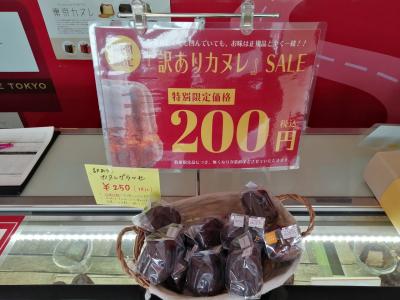 クロネコパティスリーが手掛ける「東京カヌレ」です。カヌレの種類はレギュラー6種(各税込290円)とチョコレートがコーティングされた“グラッセ”4種(各310円)の計10種類。カヌレ初だったのでレギュラーの中でもスタンダードな“バニラ”にしようと思いましたが、店員さんから「こちらもございます」と。型崩れしたものが“訳ありカヌレ”として売られていました。こちらは税込200円。当然種類は日によって変わります。この日は「生チョコ」と「ハニーリッチ」の2種のみ。バニラはなく残念でしたが、ただの味見のつもりだったのでこちらの「ハニーリッチ」を購入しました。