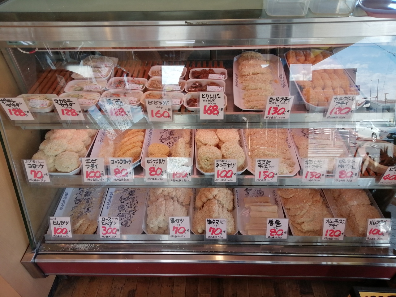 早速お目当ての揚げ物コーナーへ。おっ、ケースの中にはパン粉が付けられた状態の品々が…。注文を受けてから揚げるようです。このスタイルはありそうでなかなかありません。ハムフライ(100円)、ミンチカツ(100円)、コロッケ(70円)をすべて2個ずつ購入。値段は税抜き価格です。PayPay払いができました。