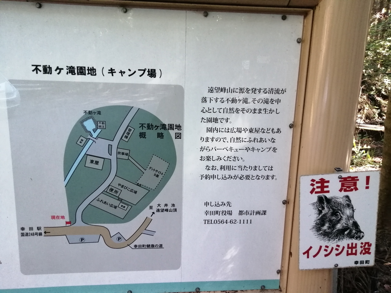 遠望峰山北西側の麓にある、かなりマイナーなキャンプ場です。規模は小さいですが設備はそこそこ整っています。もちろんトイレあり、屋根付きの水場、かまど場もあります。山の中の沢沿いにあり、とても感じのよいところです。名前の通り不動ヶ滝という小さな滝もあり、少し下流には公園も整備されています。