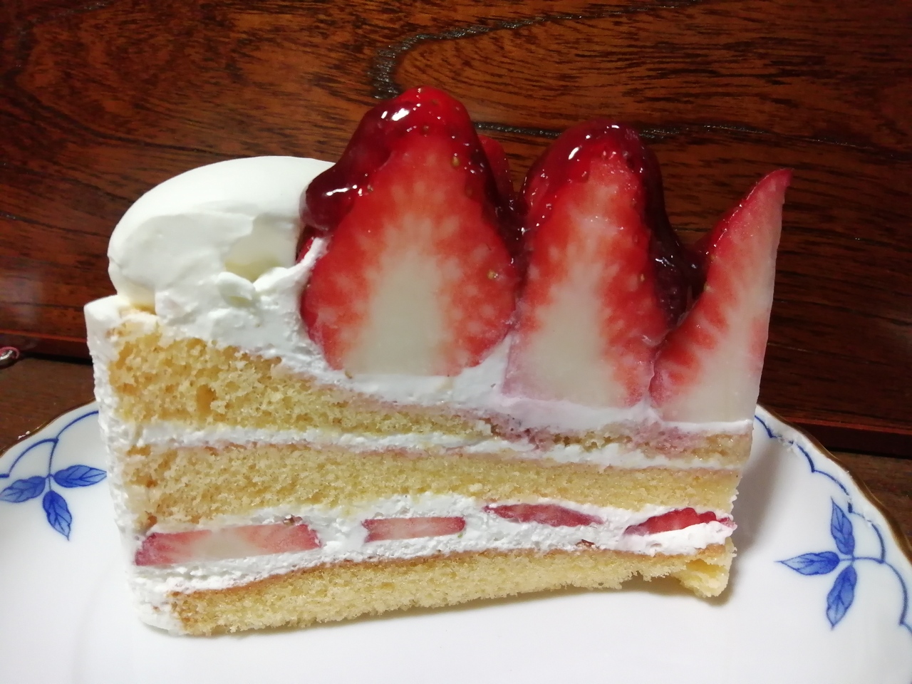 で、私は「ストロベリーインペリアル」を喫食。いわゆるイチゴのショートケーキってやつです。しかしそんじょそこらのものとは一線を画す代物です。お値段は650円+税8%也。田舎町岡崎でこの値段のイチゴのショートってそうはないと思います。ちなみにですが1番大きな直径24cmのホールは9500円+税します。