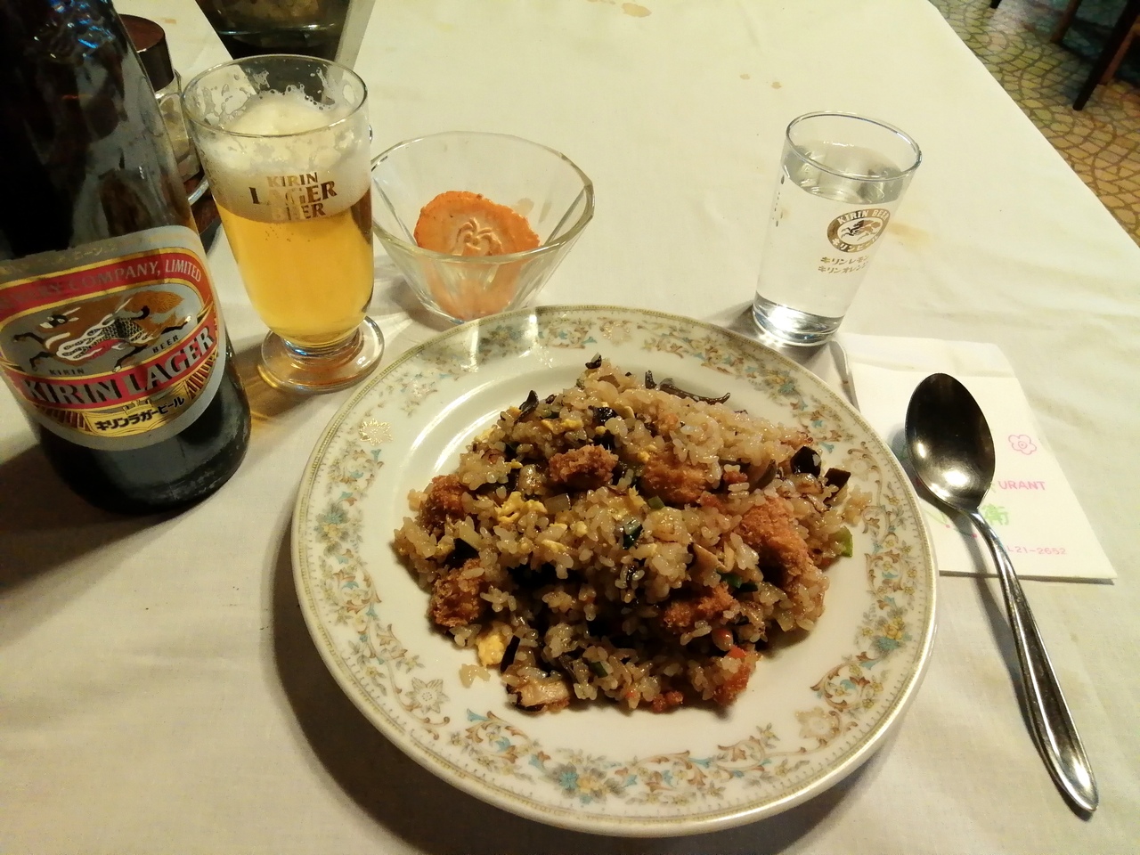 トルコライスはチャーハン風のご飯もので、ボール状の一口カツとキクラゲやしいたけ、玉ねぎなどの野菜が一緒に炒められています。面白い一品です。もちろんうまし。ビールにはえびせんが付いてきました。女将さんは物腰が柔らかく、とても丁寧な方でとっても好印象。客層も歩いて来ました的な近所の方々が多かったです。周辺住人から愛されているに違いない店です。- 旅行時期