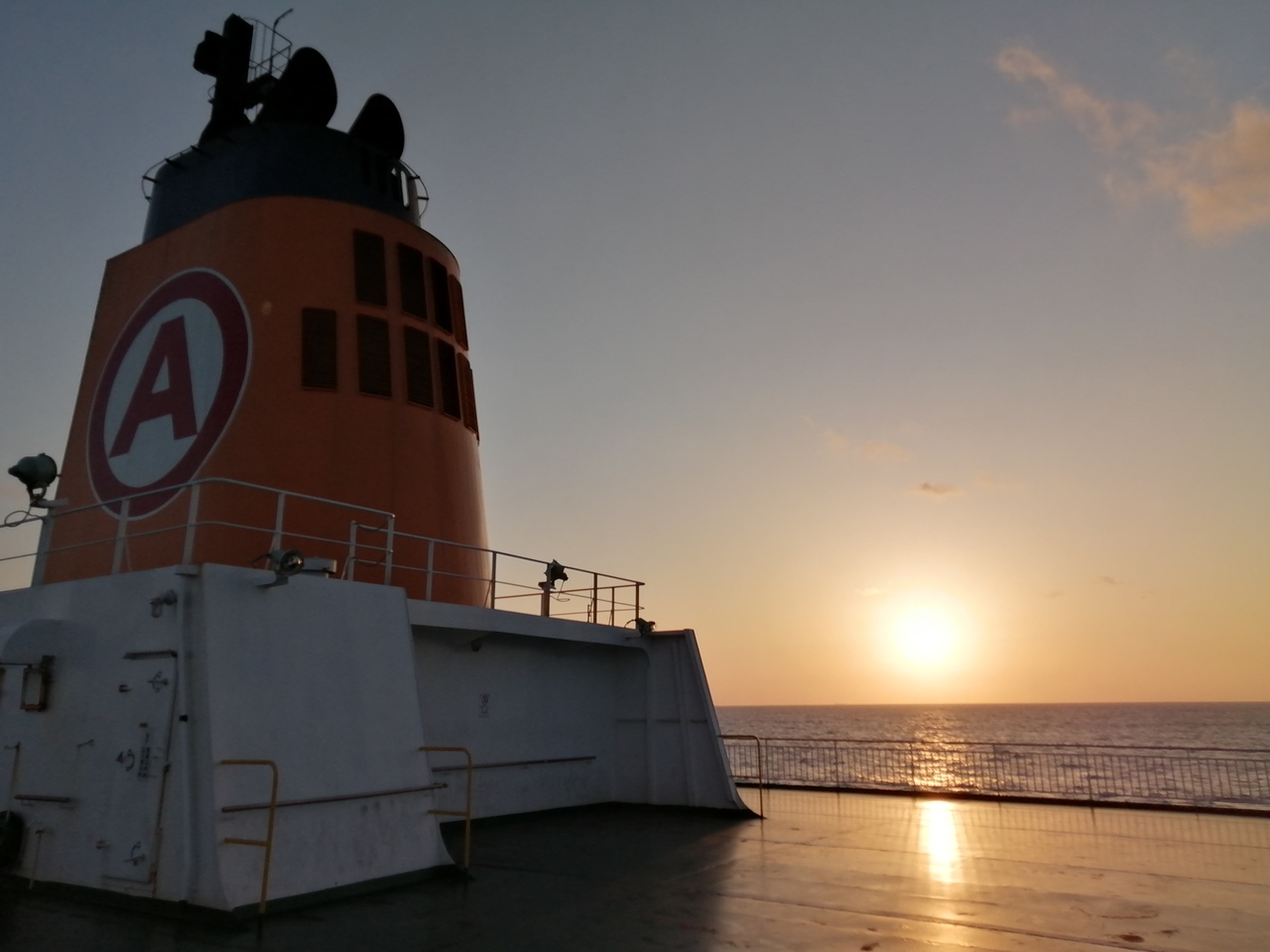 那覇から鹿児島まで「フェリーあけぼの」乗船しました。天気はいいのに台風の余波で定期便は運休。しかし運良く臨時便に乗ることができました。臨時便は途中一切寄港なしの直行便。那覇発17:00、鹿児島着は翌日昼12:00の所要19時間でした。