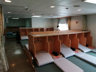臨時便ということで乗客は20人ほど。レストランでの夕食は事前注文式。2等の“雑魚寝部屋”も余裕をもって使用できました。途中、大揺れで大変でしたが…。