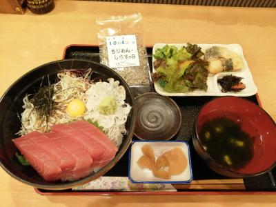 「しらす・まぐろ丼」は安定のうまさ。ちくわの磯辺揚げとサラダも付きお得感もありました。- 旅行時期
